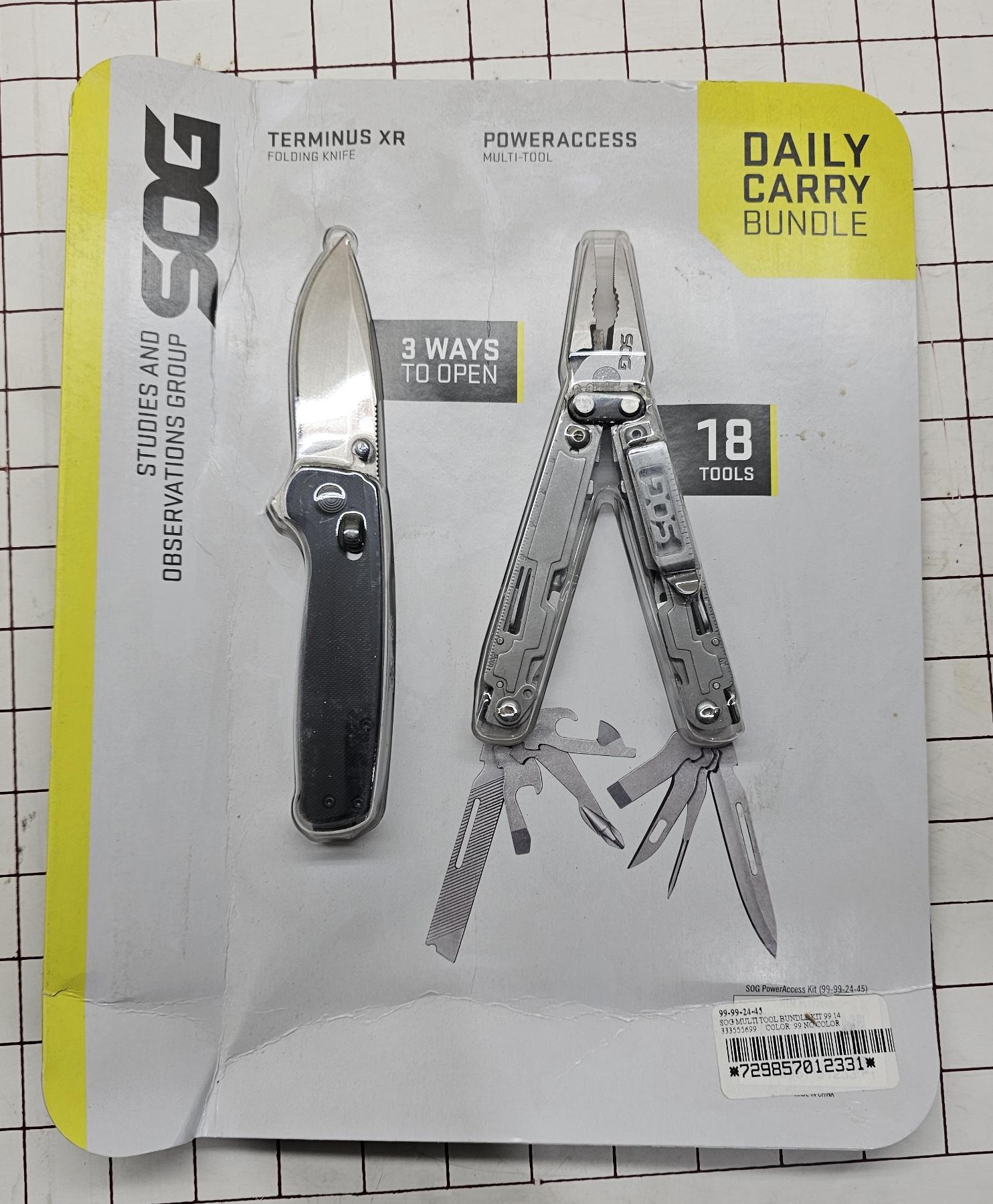 Includes folding knife and multi-tool. Lightly damaged Packaging.