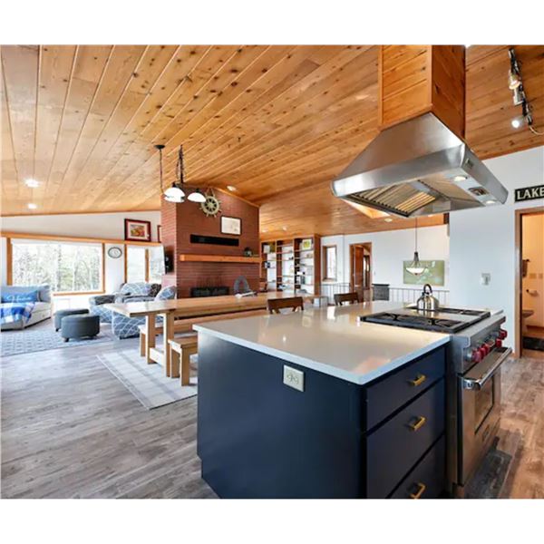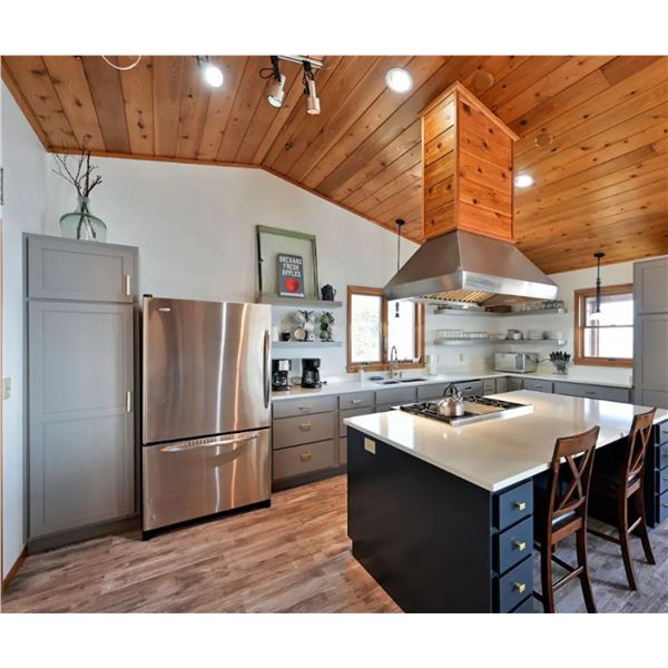 Our favorite part of the cabin is the great room with an attached screened in porch overlooking Lake Superior. The screened in porch has comfortable outdoor furniture to sit and enjoy a beverage while listening to the waves crash into the rocky shoreline less than 100 feet away. The kitchen is complete with a Wolf 4-range oven and gridle, commercial grade vent hood, dishwasher, cupboard space for days, and a full-size refrigerator on the main level as well as on the north side of the house for large groups.