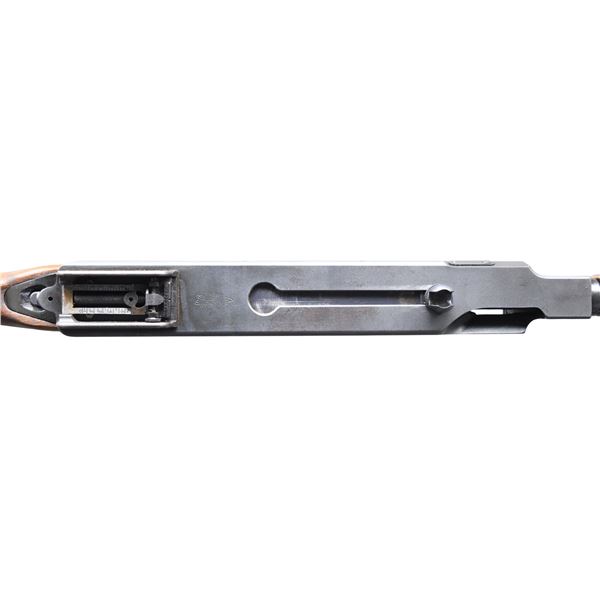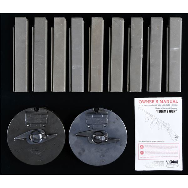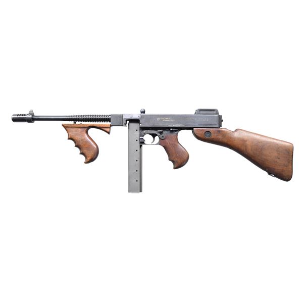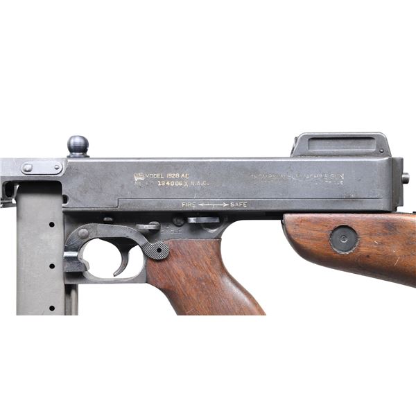 THOMPSON SUBMACHINE GUN. CURIO. Cal. 45 ACP. S# AO134006X. Bbl. 11". Classic Thompson SMG, US Model 1928 AC overstamp, manufactured by Auto-Ordnance Corporation, in Bridgeport, CT. 24 rib finned bbl. Terminated w/ unmarked Cutts compensator. Horizontal wood fore arm. Front blade sight integral w/ compensator & rear is adj. Lyman graduated sight. Hardwood, rear shoulder stock w/ trapdoor buttplate. Sling swivel at 6-O'clock below shoulder stock. Slotted top mounted cocking knob. Parkerized finish on exposed metal surfaces. Left side receiver markings are as follows: "U.S. Model of 1928 A1", w/ the "1" over-stamped "C". The "U.S." marking, before the model designation has been ground off as is typical. "Thompson Submachine Gun / Calibre 45 Automatic Cartridge". Serial number line, below the model line includes the correct "AO" prefix w/ correct "X N.A.C." suffix Right side markings include patent block on rear of receiver & "Auto-Ordnance Corporation", "Bridgeport Connecticut, U.S.A.". Trigger frame serial number matches receiver number. MAGS: 9 parkerized 30 rd., 2 blued 50 rd. Type L drums. UNATTACHED ACCESSORIES: Owners manual. CONDITION: Parkerized finish on receiver is complete & consistent w/ several light drag lines, typical of a range used firearm. Some light patina / staining, visible under close inspection. Blued finish on barrel illustrates some gentle patina & thinning, while compensator finish has more substantial thinning & patina. Some markings are easy to read w/ the addition of a white infill while others appear to have fallen prey to a more aggressive refinishing at some point. Wood furniture is dark and matches well, having a few period typical scratches & depressions. Bright bore w/ descent rifling. Fire control mechanism appears to function correctly when cycled by hand. FULLY TRANSFERABLE NATIONAL FIREARMS ACT SMG REQUIRING BATF TRANSFER BEFORE TAKING POSSESSION. (03-1858/JZ). CURIO, CLASS III. $20,000-30,000.