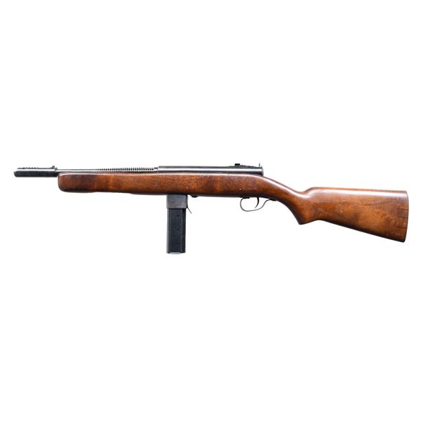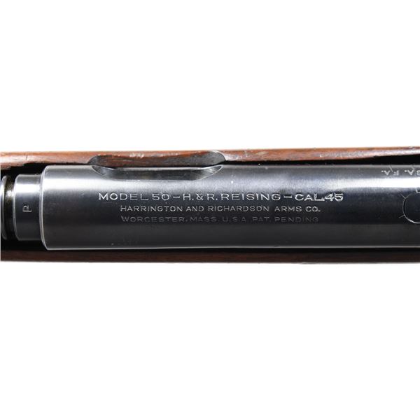 MACHINE GUN. Cal. 45 ACP. S# 17409. Bbl. 13.5" over comp. Blued barrel w/ 29 fins. In a search for another compact SMG as things were heating up in Europe in 1939, Eugene Reising went to work designing what we would eventually know as the Reising Model 50. He received a patent on his compact, closed bolt carbine, chambered in .45ACP in June of 1940, and entered into a manufacturing contract with Harrington & Richardson to facilitate production. It didn't have many competitors, as the only similar firearm was the Thompson SMG, but the Reising Model 50 was extremely accurate since it fired from a closed bolt. After submission for testing with the US Army, it was not immediately accepted since its same closed bolt mechanism that provided superior accuracy had a tendency to malfunction when not cleaned and maintained regularly. Since the Thompson SMG faced a shortage, the United States Marine Corps adopted the Reising Model 50 with a parkerized finish, cooling fins, a muzzle device to assist with recoil and with select-fire capability. They then requested a modified version for the "Para Marines" that utilized a folding wire stock in a pistol grip design, and without the muzzle device. It was known as the Reising Model 55 and shared by the Tank crews. This example, the Model 50 is a select fire, closed bolt sub machine gun. It has a 20rd mag-well with 29 cooling fins and a 6 slot muzzle device. Exposed metal surfaces are finished in a dark bluing. Full length wooden stock w/ right side sling swivels. Graduated elevation adjustable rear peep sight & drift windage adjustable front post sight incorporated into the muzzle device. Receiver is stamped on top "MODEL 50 – H.&R. REISING – CAL .45 / HARRINGTON AND RICHARDSON ARMS CO. / WORCESTER, MASS. U.S.A. PAT PENDING". MAGS: (3 total) 1 factory blued 20rd.& 2 blued 30 rd. CONDITION: Finish is complete & consistent w/ some light thinning on high spots & in areas of mechanical intervention. Stock illustrates some light scratches and impressions typical of rack earned wear w/ guns stored in vertical racks. Bright bore w/ strong rifling. Fire control mechanism appears to function correctly when cycled by hand. NATIONAL FIREARMS ACT MG REQUIRING BATF TRANSFER BEFORE TAKING POSSESSION. FULLY TRANSFERABLE. (03-1763/JZ). CLASS III CURIO. $6,500-9,500.