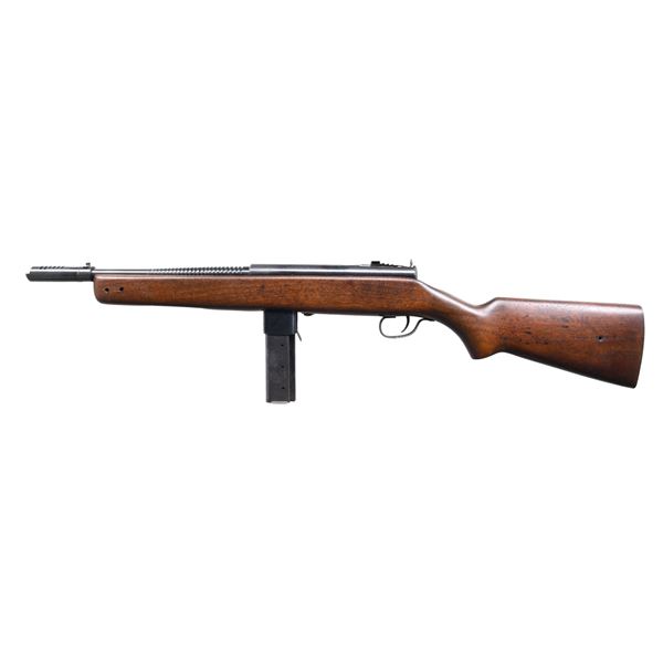 Cal. 45 ACP. S# 1994. Bbl. 13.5" over comp. Blued barrel w/ 24 fins. In a search for another compact SMG as things were heating up in Europe in 1939, Eugene Reising went to work designing what we would eventually know as the Reising Model 50. He received a patent on his compact, closed bolt carbine, chambered in .45ACP in June of 1940, and entered into a manufacturing contract with Harrington & Richardson to facilitate production. It didn't have many competitors, as the only similar firearm was the Thompson SMG, but the Reising Model 50 was extremely accurate since it fired from a closed bolt. After submission for testing with the US Army, it was not immediately accepted since its same closed bolt mechanism that provided superior accuracy had a tendency to malfunction when not cleaned and maintained regularly. Since the Thompson SMG faced a shortage, the United States Marine Corps adopted the Reising Model 50 with a parkerized finish, cooling fins, a muzzle device to assist with recoil and with select-fire capability. They then requested a modified version for the "Para Marines" that utilized a folding wire stock in a pistol grip design, and without the muzzle device. It was known as the Reising Model 55 and shared by the Tank crews. This example, the Model 50 is a select fire, closed bolt sub machine gun. It has a 20rd mag-well with 24 cooling fins and a 6 slot muzzle device. Exposed metal surfaces are finished in a dark bluing. Full length wooden stock w/ steel butt plate. Graduated elevation adjustable rear peep sight & drift windage adjustable front post sight incorporated into the muzzle device. Receiver is stamped on top "MODEL 50 – H.&R. REISING – CAL .45 / HARRINGTON AND RICHARDSON ARMS CO. / WORCESTER, MASS. U.S.A. PAT PENDING". MAGS: 2 factory blued 20rd. CONDITION: Finish is complete w/ some light thinning on high spots, in areas of mechanical intervention & a small area on top of receiver, just forward of rear sight. Stock illustrates some light impressions typical of rack earned wear on vertical racks storage. Stock has 3 holes on left side, coinciding w/ a typical side position for sling mounts. Bright bore w/ strong rifling. Fire control mechanism appears to function correctly when cycled by hand. NATIONAL FIREARMS ACT MG REQUIRING BATF TRANSFER BEFORE TAKING POSSESSION. FULLY TRANSFERABLE. (03-1765/JZ). CLASS III CURIO. $6,500-9,500.