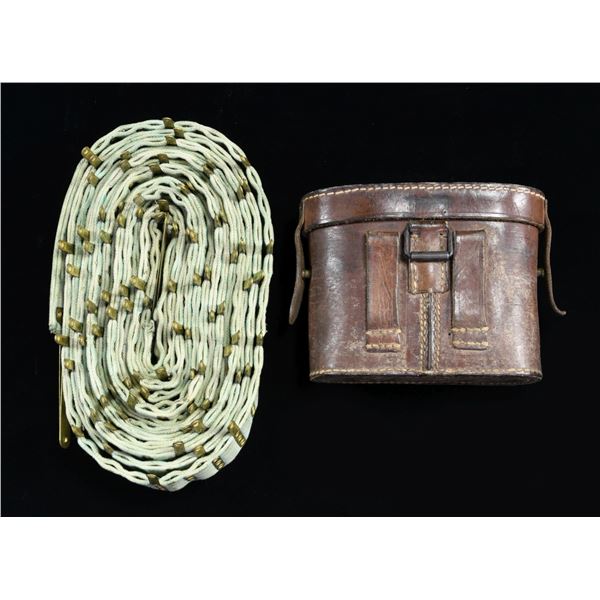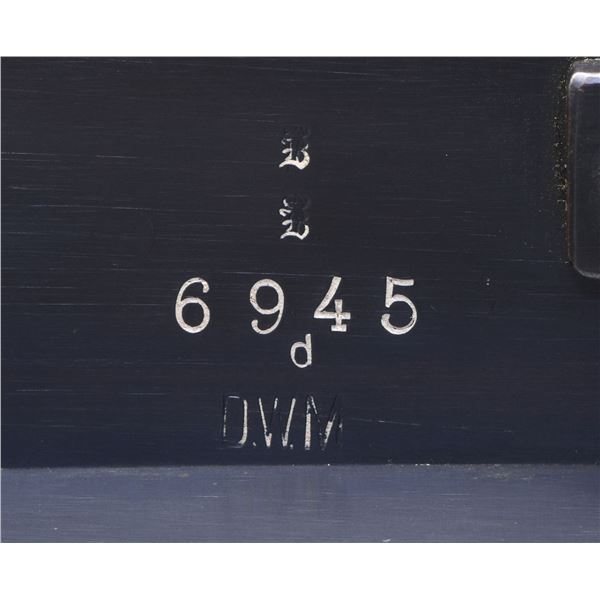 ON ORIGINAL SLED MOUNT WITH OPTICS. CURIO. Cal. 8mm. S# 46945. Bbl 30". This MG08 Maxim was mfg. by D.W.M. in Berlin in 1918. Items that correspond matching the original S# in some variation of 46945, including parts as they get smaller dropping numbers off to become shorter & fit the space including 46945, 6945, 945 & 45 consist of left side plate, top cover, bbl. jacket, sights, feed block, cocking lever, spade grip assembly & possibly others that are less clearly visible. Oil caps on spade grips are matching numbers, and thread off & on easily, retained by both present retention springs. Bolt marked 4595. Original sled mount. MAGS: 1 cloth belt w/ brass tabs, dated 1943. UNATTACHED ACCESSORIES: ZF12 Optics w/ original leather case. CONDITION: This is a beautiful example of the classic original belt-fed that started an entirely new generation of firepower. The finish is strong, consisting of bluing on sideplates, top cover, & barrel jacket. The receiver finish is as complete as any this cataloger has encountered. Everything moves fluidly and is extremely smooth. The spade grips are seldom encountered in this condition for a working firearm. Markings are filled w/ white for a striking contrast, easy to read. The oil caps are matching in numbers, and thread in and out effortlessly. The hardwood grips still retain their finger grooves and even the checkering is intact and in nice condition. The ZF12 optics appear to have the original gray / green finish on them, w/ all markings clear and intact. Bullet drop compensator is adjustable from 400m to 2000m & moves fluidly. The glass is quite clear w/ sharp reticle. Sled mount still has some of the original spare parts boxes, which are often missing. These were designed to hold extra locks, spare parts & tools. The mount, remarkably enough still retains the pads, front & rear, which are most often long gone. It has an even coat of paint that looks original. The screw drive elevation adjustment moves freely & it enjoys full adjustment. Forward water drain below bbl. jacket functions smoothly. Firing mechanism functions smoothly in all aspects & appears to function correctly when cycled by hand. Bore is bright w/ strong rifling. PROVENANCE: From the Lifelong Collection of Brian Linde. (03-1817/JZ). THIS IS A NATIONAL FIREARMS ACT CURIO & RELIC REQUIRING BATF TRANSFER BEFORE TAKING POSSESSION. FULLY TRANSFERABLE. CURIO. CLASS III. $12,000-18,000.