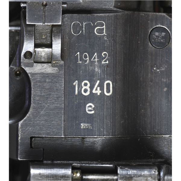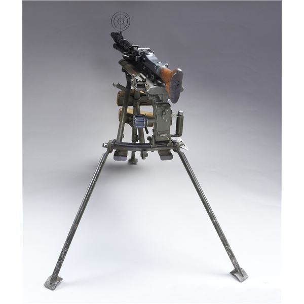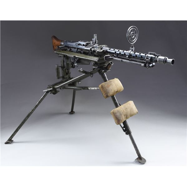 GUN. PRE 86 DEALER SAMPLE (KEEPER). Cal. 8mm. S# 1840E. Bbl. 24". 1942 dated "cra" marked German MG34. The MG34 is one of the most recognizable of the German WWII era MG's. Designed by Mauser on order of the Waffenamt, it was manufactured in the early days where German tolerances & quality were front & center, over the later guns all nations involved would be forced to manufacture which placed the focus on quick & inexpensive. The MG34 can easily be described as functional artwork. 109 Different parts were manufactured from bar stock, obviously before the pressed & stamped manufacturing processes would eventually take over. Before WWII was over, almost 500,000 MG34's were produced by 5 different firms. The trigger mechanism of the MG34, though complicated in design, was extremely simple for the operator since no external selector was necessary to switch between semiautomatic & fully automatic fire. The elongated trigger could simply be depressed at the top for semiautomatic & squeezed at the bottom for full automatic fire. With an overall length of almost 48" & a sight radius of 21", neither accuracy nor the ability to lay down an enormous amount of lead would pose to be a problem. Front sight is a folding blade, rear sight is a graduated notch from 200 to 2000 meters. Visible Waffenamt markings in several locations. Heavily knurled cocking handle. Ventilated barrel shroud with AA sight base doubling as front sling swivel, currently sporting AA "spider web" front sight. Integral folding bipod locks correctly in retracted position. Correct barrel booster locks into position with a spring loaded mechanism built into the front sight mount. Matching numbers "1840e" on several visible parts such as receiver, stock & barrel jacket. Several German Party symbols scattered throughout as typical of period German manufacture. Lafette tripod is painted dark green and appears to be functional in all aspects. Trigger mechanism is smooth, as is the traverse & elevation mechanism. This tripod still retains the frnt pads & coverings. UNATTACHED ACCESSORIES: Lafette Tripod, 5 lengths of non-desintegrating belt links. CONDITION: finish on all external metal parts is a little nicer than par with the majority of these era guns. Coverage is complete with some signs of handling and use as expected. Several of the parts are original German arsenal replacements, bearing several different numbers. Numerous Waffenamts and factory codes, in several locations. Hardwood stock presents as usual, w/ scattered light impressions and a small crack on left side running rearward from the steel collar, however it doesn't appear to have any structural significance. Black pistol grips are in nice condition demonstrating some impressions & a few light chips under close inspection. The fire control mechanism appears to function correctly when cycled by hand. Bright shiny bore w/ strong rifling. NATIONAL FIREARMS ACT MG REQUIRING BATF TRANSFER BEFORE TAKING POSSESSION. PRE-86 DEALER SAMPLE (KEEPER). MUST BE AN FFL W/ SOT IN ORDER TO TAKE POSESSION. PROVENANCE: From the Lifelong Collection of Brian Linde. (03-1840/JZ). CLASS III. $8,000-14,000.