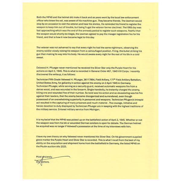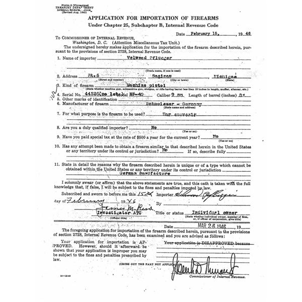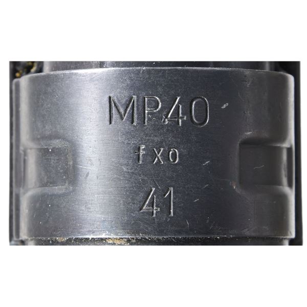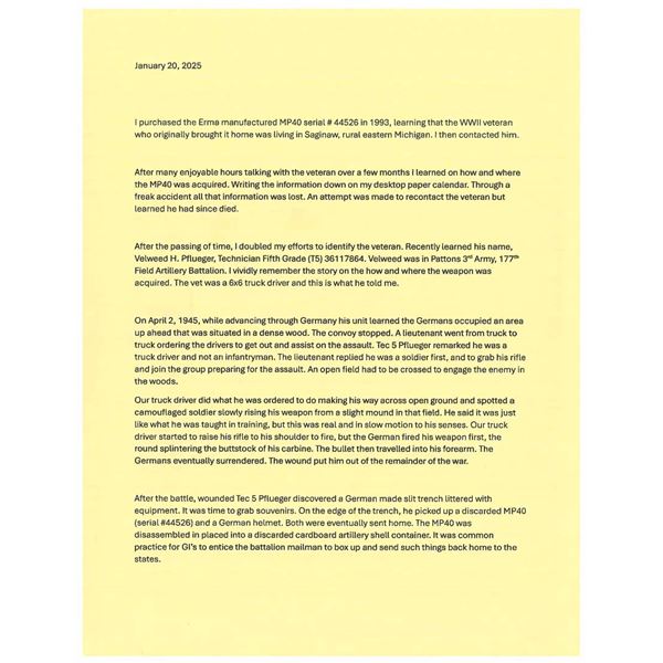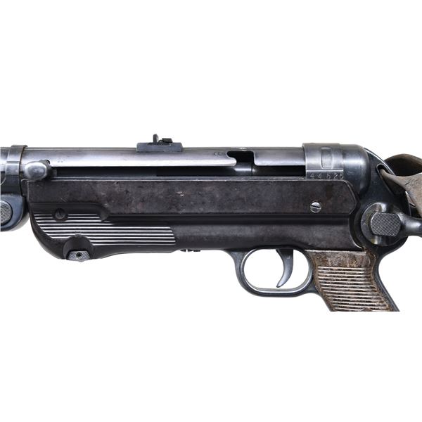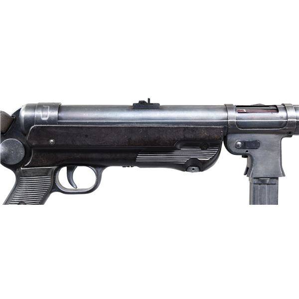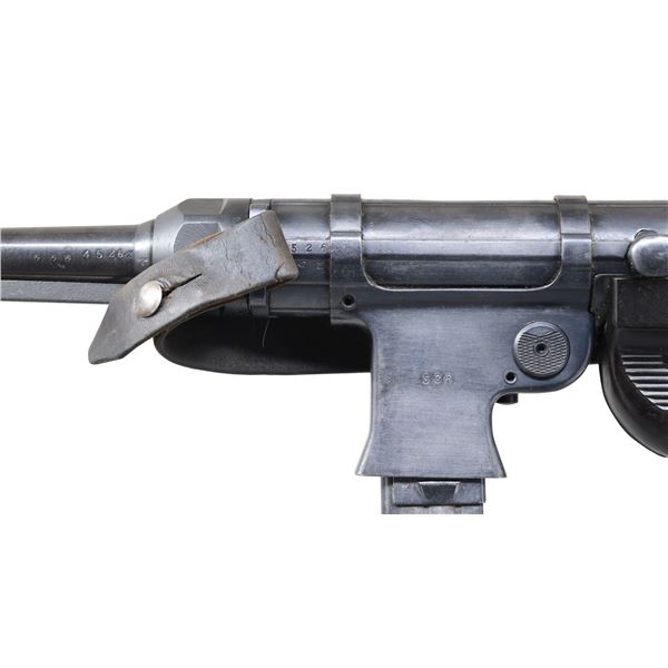 MP40 SUBMACHINE GUN, BATTLEFIELD PICKUP FROM THE EUROPEON THEATER OF WWII. Cal. 9mm. S# 44526. Bbl. 10". A beautiful example of an iconic, German, WWII era submachine gun w/ an interesting story, in amazing condition. It is accompanied by a copy of the original IRS Form 6, listing this firearm, dated February 15, 1946. It also includes an interesting record of events from an interview of the original owner of this firearm, Silver Star & Purple Heart recipient, Velweed Pflueger, about his experience in WWII, leading to the acquisition of this firearm. Of all the German WWII era SMGs, the MP40 may be the most iconic of them all. Its slow cyclic rate combined w/ decent sights & pleasant ergonomics make it as fun to operate as it is interesting to look at. It utilizes a very simplistic, yet incredibly smooth open bolt firing mechanism. The recoil system is typical of German over engineering consisting of a 3 piece telescoping rod w/ a captured spring that doubles as the connection point for the firing pin which slides inside of the bolt. The safety mechanism is an extremely simple design which shares commonalties w/ other WWII era SMGs. It consists of a rearward notch that interfaces w/ the cocking handle holding the bolt to the rear. This example was manufactured by Haenel. Early, first generation mag. housing which is smooth, w/ a square notch facing the shooter. All visibly numbered parts share matching numbers which is incredibly desirable & increasingly rare these days. The extruded receiver tube matches the grip frame, barrel, trigger housing, stock, bolt, barrel nut, rear sight & front sight. Hooded fixed blade front sight. Dual leaf rear sight is windage drift adjustable. Waffenamts appear on multiple parts including rear receiver just above folding stock mechanism "WaA254", front sight mechanism just forward of resting bar is also Eagle "37", front of receiver tube just rear of bbl. nut Eagle w/ "WaA44". Under folding stock, dark brown Bakelite grips & lower receiver cover. MAGS: 4 steel 32 rd. UNATTACHED ACCESSORIES: 1 original mag. loader, 1 spare barrel assembly, 2 3-mag. pouches & black, nylon Galati transport case. CONDITION: .Original finish on all exposed metal surfaces are remarkably complete & consistent w/ light thinning on high spots & in areas of mechanical intervention. Stock locks tight & remains firm as intended in both folded & extended positions. Grips appear in nice condition free of any obvious structural damage beyond some light handling marks under close examination. Bakelite receiver has a few light, typical use marks w/ a few very light scratches Bright bore w/ strong rifling. This is in amazing condition for a battlefield pickup in the Europeon Theater of WWII. Fire control mechanism appears to function correctly when cycled by hand. THIS IS A NATIONAL FIREARMS ACT CURIO & RELIC MACHINE GUN REQUIRING BATF TRANSFER BEFORE TAKING POSSESSION. FULLY TRANSFERABLE. (PROVENANCE) Copy of IRS Form 6 "Application For Importation of Firearms" dated 02/15/46, listing this firearm for Velweed Pflueger, obtained as a souvenir & letter from the consigner detailing his conversation w/ Mr. Pflueger, his time in WWII & how he obtained this firearm. (03-1844/JZ). CURIO. CLASS III. $18,000-28,000.