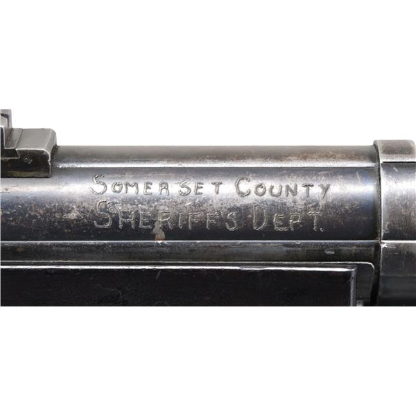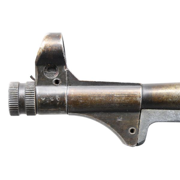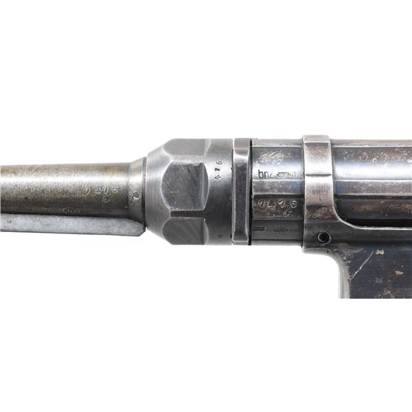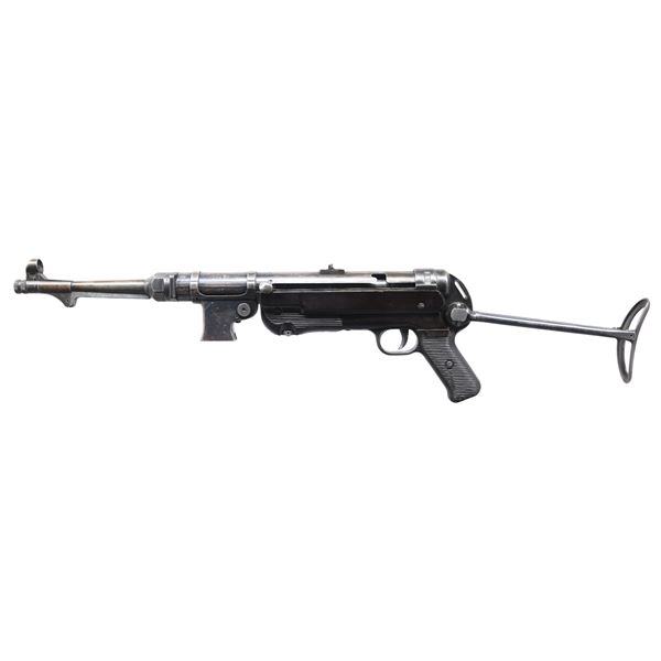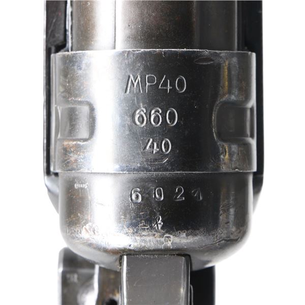 SIDE STEYR MP-40 SUBMACHINE GUN WITH SOMERSET COUNTY MAINE SHERIFF'S DEPARTMENT TRANSIT CASE. Cal. 9mm. S# 1416. Bbl. 10". MP-40 submachine gun mfg. during World War II by Steyr. Left side of the receiver is marked with Steyr's "bnz" code, above the S# and Steyr Eagle/WaA623 acceptance proofs. Right side of the receiver is electro-penciled "SOMERSET COUNTY/ SHERIFF'S DEPT.". Lower assembly is marked "MP40/ 660/ 40", and is fitted with black bakelite furniture. Standard hooded blade front sight, with square notch rear sight. Slab side mag. housing. Matching numbers are present on the receiver, rear sight assembly, bbl. nut, bbl., alloy resting bar, front sight hood, as well as on the bolt. Firing pin / telescoping recoil mainspring assembly, and lower assembly are mismatched. Mag. is absent. UNATTACHED ACCESSORIES: wood transit case, with a Maine Somerset County Sheriff's Department insignia on the lid. CONDITION: good, with metal components retaining much of their original blue finish, exhibiting areas of wear and thinning that shows through to gray and brown patinas. Shoulder rest on stock exhibits pitting and some grind marks from prior cleaning. Bright bore, exhibiting consistent light to mild pitting, while retaining good to strong rifling throughout. Bakelite furniture shows scattered marks and nicks, as well as a couple of chips from handling and storage, but otherwise remain sturdy and serviceable. Left grip panel exhibits a gouge that does not affect serviceability. Transit case shows scattered marks from handling and storage, as well as a few losses to the sheriff's insignia, but otherwise is good. A nice example of a desirable early slab side Steyr MP-40. PROVENANCE: From the Estate of Ivan Lee Shapiro. NATIONAL FIREARMS ACT MG REQUIRING BATF TRANSFER BEFORE TAKING POSSESSION. FULLY TRANSFERABLE. (03-1769/MLW). CURIO. CLASS III. $12,000-16,000.