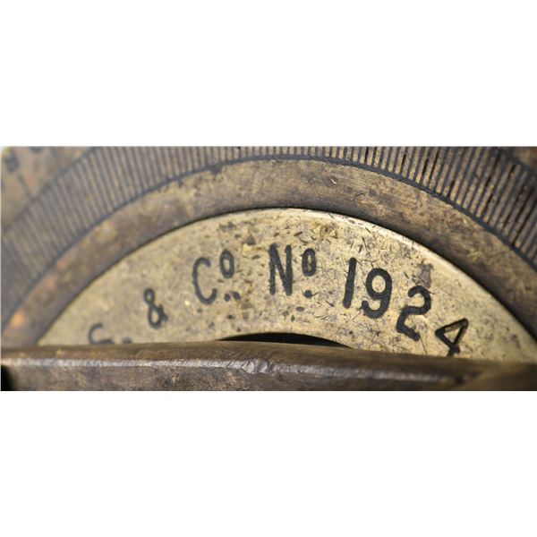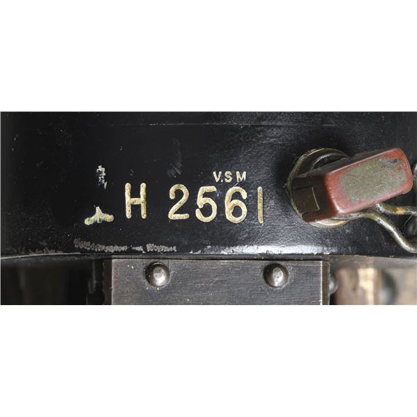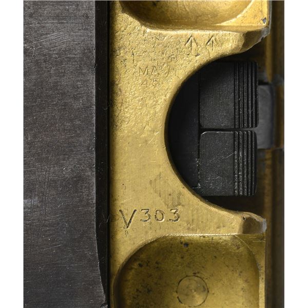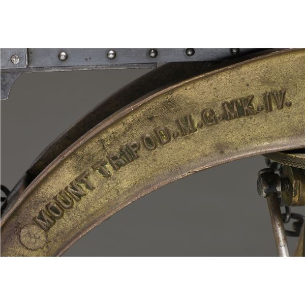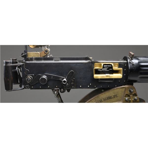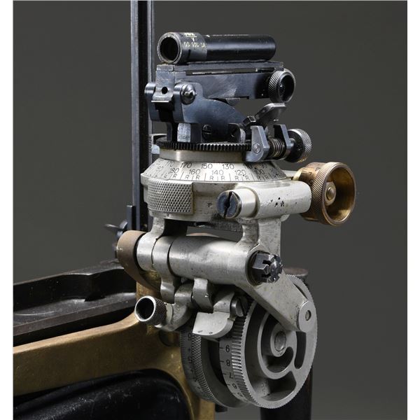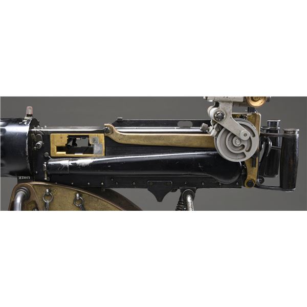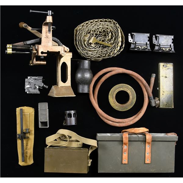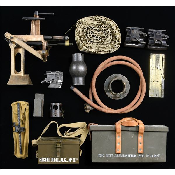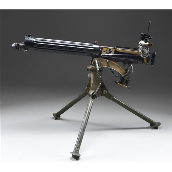 FLUTED BARREL JACKET WITH PLETHORA OF PARTS & ACCESSORIES. Cal. .303. S# H2561. Bbl. 28". The Vickers Machine Gun was originally referred to as the Vickers Maxim. It was adopted by Great Britain in 1912. It remained a principal machine gun through WWI & WWII until being replaced by the "L7A1 GPMG" in the 1960s. Though they were at one time available w/ two different water jackets, a corrugated style & the more traditional smooth side Maxim type, this gun is of the corrugated style. They were available in both ground gun & in aircraft gun variants. This example appears to be a Portuguese contract gun, as it is marked FBT on the right side of the receiver. All exposed steel surfaces are finished in a nice matching dark black, pleasantly accented by the traditional brass parts including the water jacket plugs, the feed block and the left-side scope mount as well as the traditional tripod. The beautiful hardwood spade grips have steel oil caps that include the oil brushes in matching black steel. This example comes w/ a standard brass & steel ground tripod. Tripod has steel legs w/ the rear most measuring 26" in length and the front legs measure 22" in length. All three legs are adj. for height and/or configuration and places the bottom of the receiver to rest at approximately 29" from the ground. The tripod's steel cradle locks into the 360° marked brass portion of the tripod, which is elevated an additional 7" above the legs of the tripod. The elevation mechanism utilizes a steel wheel for micro adjustments while traversing freely. The entire tripod is currently painted green, aside from the brass traverse portion, which retains its natural finish with degree marks and numbers painted black. This Vickers is equipped w/ iron sights which consist of a protective blade front sight forward of the water jacket & an elevation adj. rear peep sight marked in meters from 0 to 2,600 with a flip-up battle sight for close range combat. It is sporting the correct brass scope mount on the left side marked "Bracket, Dial Sight, MK II" on top. Mount sporting MKII Dial sight. Current configuration appears to be 7.62x54R and also includes many parts necessary to convert to 8mm Mauser. BATF Registry indicates manufacturer as "VS&M" w/ the originally listed caliber as .303 British. MAGS: 1 cloth belt with brass tabs and eyelets. UNATTACHED ACCESSORIES: Brass belt filling machine (partially complete), Australian No. 8 Mk. 1 belt box w/ leather straps, MK II Dial Sight in green steel box w/ accessories, 2 spare feed blocks labeled 8mm, 1 spare lock assembly, appears to be .303 British, 1 MKI Flash Eliminator, 1 MKI Foresight Deflection Bar in tan canvas case, 1 Steam Hose, & 1 Slide Rule for .303 MK VIII ammo. CONDITION: Finish on receiver external metal surfaces enjoy nice coverage for such an early example, ranging from full to thin w/ some gentle patina under close inspection. Most significant thinning is in areas of mechanical intervention. Coverage on fluted barrel jacket very complete and consistent with some thinning on high spots as would be expected. Brass feed block and scope mount are very nice w/ natural coloring. Hardwood spade grips are surprisingly free of normal dings & impressions with a brown painted finish. Steel oil brush caps are both intact & thread freely in & out of grips. Tripod legs move freely and steel portions retain some of an earlier green painted finish. Brass parts retain their natural finish & staining. Brass plate on riser still retains clear markings and cradle rotates smoothly. Fire control mechanism appears to function correctly when cycled by hand. Bore is bright w/ strong rifling. PROVENANCE: From the Lifelong Collection of Brian Linde. NATIONAL FIREARMS ACT MG REQUIRING BATF TRANSFER BEFORE TAKING POSSESSION. FULLY TRANSFERABLE. (03-1831/JZ). CURIO. CLASS III. $12,000-20,000.