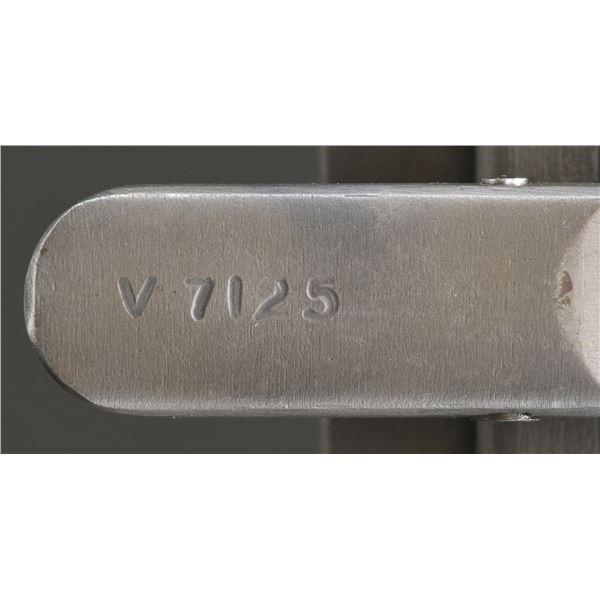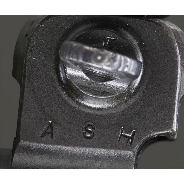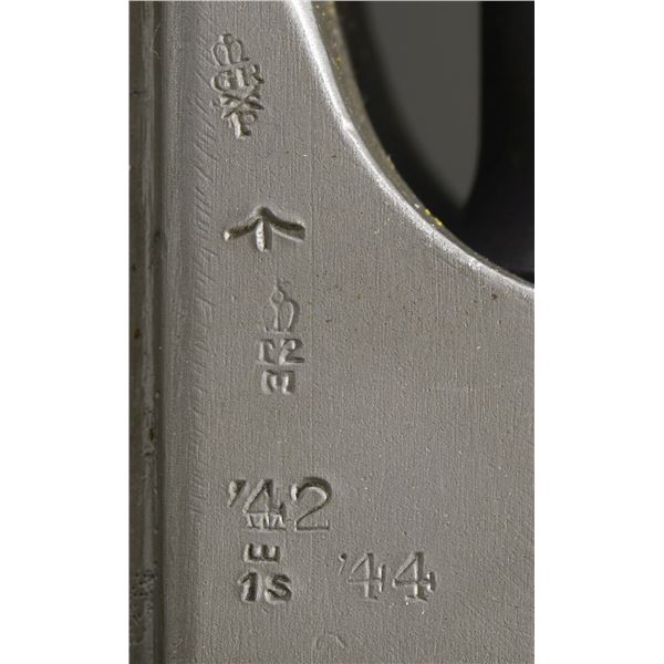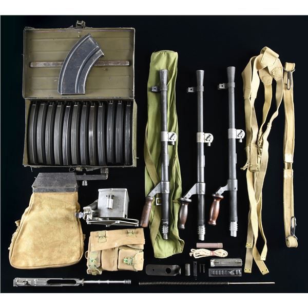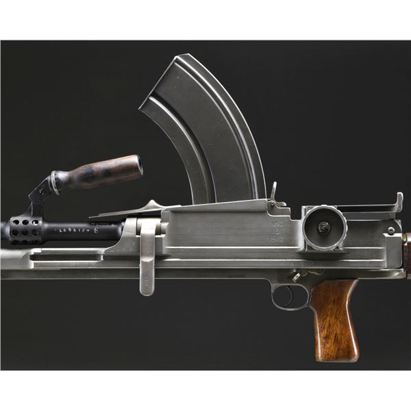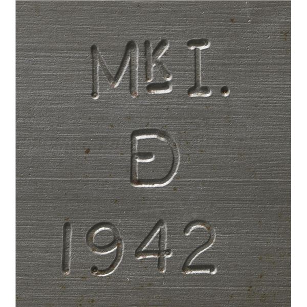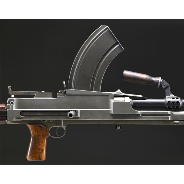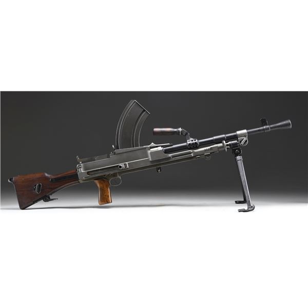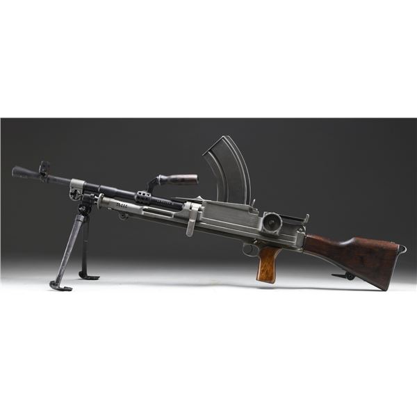 MK1 LMG. Cal. 303. S# X3402. Bbl. 25" with detachable flash hider. Offset sights with protected blade front & adjustable aperture rear. Very good example of the iconic MK1 303 British Bren light machine gun. The name Bren is derived from Brno where the ZB-26 LMG originated from & Enfield the site of the British small arms factory. Bren variants saw widespread usage in many 20th Century conflicts most famously in WW2 & later in Korea, the Malayan Emergency, the Rhodesian Bush War & the Falklands. Registry lists manufacturer as BSA & cal. as 303. Left side of receiver marked "MKI/D/1942". Bbl. latch marked "V7125. Left front of receiver has British proofs, broad arrow, both '42 & '44 date. Bbl. marked with British export ton proofs & "LB58129". Bbl. & bipod have Suncorite black paint finish. Balance of the metal parts have arsenal rework gray parkerized finish. Hardwood buttstock & pistol grip. Right side of butt marked "S.111/(Broad Arrow)". MAGS: 14-30 rd. UNATTACHED ACCESSORIES: mag transit case, one canvas bbl. cover, three spare bbls., spare bolt assembly, spare piston assembly, mag loader, sling, spare mag door cover, Bren tool set that appears to be missing a couple pieces & brass catcher. CONDITION: stock & pistol grip have arsenal rework appearance with armorer reinforcement repair on top & bottom of butt, scattered light dings & handling marks. Hardwood carry handle shows a couple small cracks, some black staining, dings & handling marks. Bbl. & bipod retain 75% arsenal applied Suncorite with some pitting on bipod legs, scattered flaking, edge wear & light oxidation. Balance of metal retains 90% arsenal rework parkerized finish with some oil staining, light oxidation, scattered edge & operational wear. Bbl. latch & mag door cover appear a bit loose but functional. Action otherwise is functional when hand cycled. Bore is mostly bright with some light pitting & scattered frosting but strong rifling. PROVENANCE: From the Lifelong Collection of Brian Linde. NATIONAL FIREARMS ACT SMG REQUIRING BATF TRANSFER BEFORE TAKING POSSESSION. PRE-86 DEALER SAMPLE. YOU MUST POSESS AN FFL/SOT TO PURCHASE THOUGH IT MAY BE RETAINED AS A PERSONAL FIREARM UPON RELINQUISHING FFL. (03-1837/MJC). CLASS 3. $8000-13000.