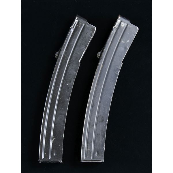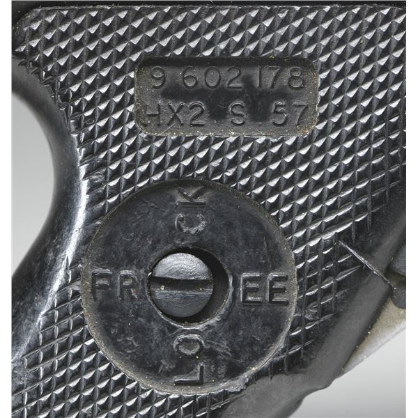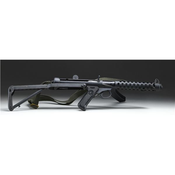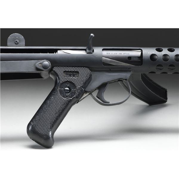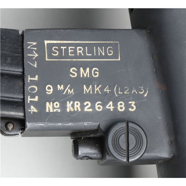 JOHN NORRELL MKII TUBE. Cal. 9mm. S# J-2044. Bbl. 8.5". The Sterling SMG was originally developed by G.W. Patchett in the 1940s and originally named simply "The Patchett". Several variations were tested & offered, including semiautomatic-only carbines, & numerous versions of the SMGs that were eventually adopted by New Zealand, Canada, India & the United Kingdom. This example was built by John Norrell on a Norrell tube. It is often compared to the STEN, based on its tubular receiver & left-side horizontal magazine placement. The shoulder stock is a sleek, folding type that collapses & folds under the receiver tube, almost out of sight, & can be operated in both open & closed configurations. Right side, reciprocating charging handle. Magazines have a capacity of 34 rounds and a slight curvature, arching forward. They do have the ability to operate w/ some STEN & Lanchester magazines as well. The operating mechanism is a select-fire, open bolt, blowback operated design. There is a safety / selector on the left side, above the pistol grip. Protected post front sight w/ dual aperture rear peep sight located towards the rear of the receiver tube. It is serviced by removing the end cap at the rear of the receiver tube, where the recoil spring & bolt are removed to the rear. It currently sports a green canvas sling. Original Sterling markings on the mag. well are highlighted in white for an attractive contrast. Norrell markings on top of tube above charging slot. MAGS: 3 Steel 34 rd. CONDITION: Complete & consistent finish w/ only some light drag lines usually typical of vertical rack storage to indicate prior use. Bright bore w/ strong rifling. Fire control mechanism appears to function correctly when cycled by hand. NATIONAL FIREARMS ACT MG REQUIRING BATF TRANSFER BEFORE TAKING POSSESSION. FULLY TRANSFERABLE.PROVENANCE: From the Lifelong Collection of Brian Linde. (03-1834/JZ). MODERN CLASS III. $6,000-9,000.