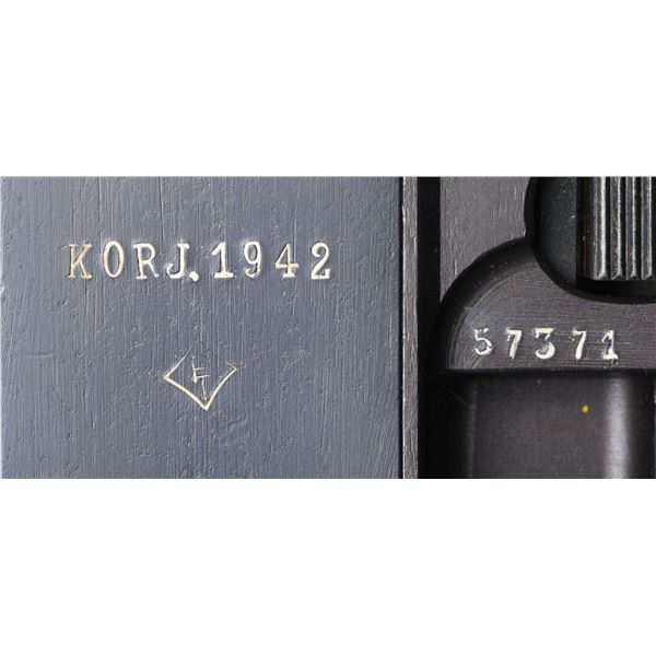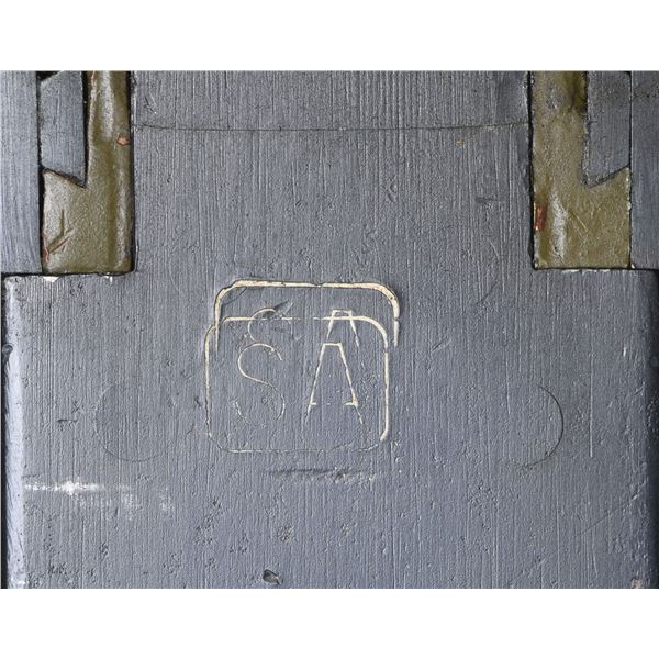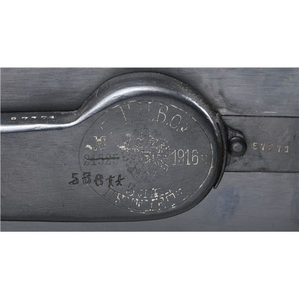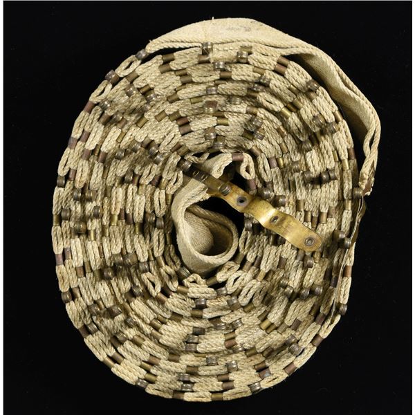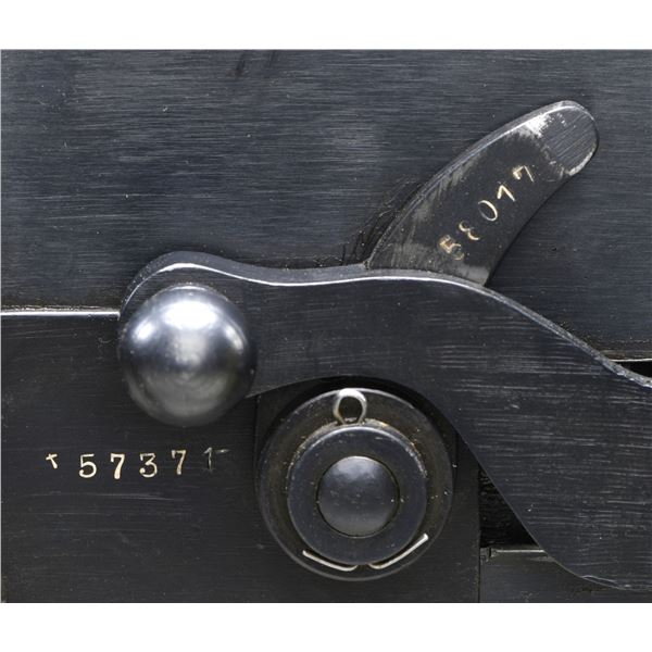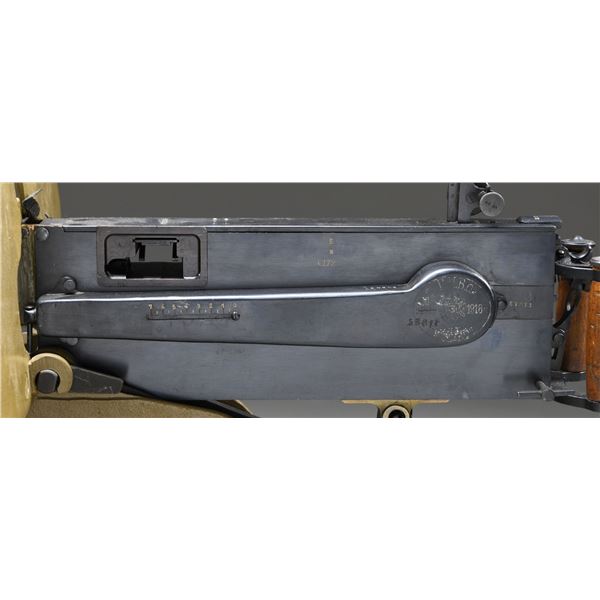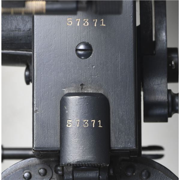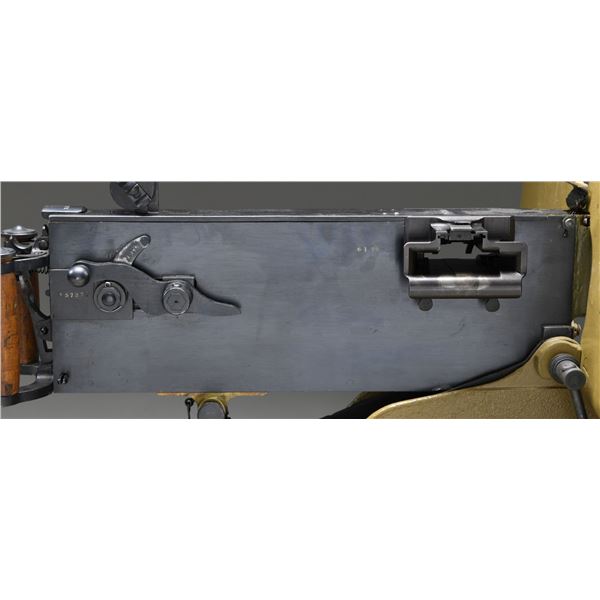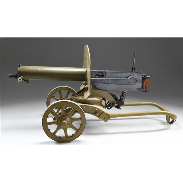 UTILIZING FINNISH PARTS ON GERMAN MG08 RECEIVER. Cal. 7.62x45R. S# 6172. Bbl. 30". A beautiful example of a WWI German Maxim Machine Gun assembled in the Russian Model 1910 configuration, as reworked by the Finnish. NFA Registry lists the manufacturer / importer as "Germany WWI Spandau 1917". Although the paperwork states 7.92 as the caliber it is presently chambered in 7.62x54R. The receiver & sideplates retain their German markings. The fusee cover is Russian, retaining some of the original nomenclature, highlighted in white for a sharp contrast and easier to read. The top cover & the majority of the remaining parts are Finnish, many bearing matching serial numbers. This example has a smooth water jacket, matching in finish to the armor plate & 1910 Sokolov wheeled mount. Exposed blade front sight coinciding w/ slot in armor plate to line up with the windage & elevation adjustable rear sight, marked from 100 meters to 2000 meters. Blued finish on receiver & all exposed metal parts rearward of the armor plate. Matching painted green finish on water jacket, armor plate & tripod. Hardwood spade grips w/ blued hardware. MAGS: 1 cloth belt w/ brass eyelets & tabs. CONDITION: Gun & mount are in beautiful condition. Blued components enjoy complete & consistent coverage. Many markings are filled w/ white for a sharp contrast both attractive & easy to read. Painted portions are matching in coverage & color. Hardwood grips have typical period correct impressions & blued surfaces match the remainder of components w/ complete coverage. Both the mount & firearm components that move, do so w/ ease & retain fluid movement. Bore is bright w/ strong rifling. Fire control mechanism appears to function correctly when cycled by hand. NATIONAL FIREARMS ACT MG REQUIRING BATF TRANSFER BEFORE TAKING POSSESSION. FULLY TRANSFERABLE. PROVENANCE: From the Lifelong Collection of Brian Linde. (03-1816/JZ). CURIO CLASS III. $8,000-12,000.