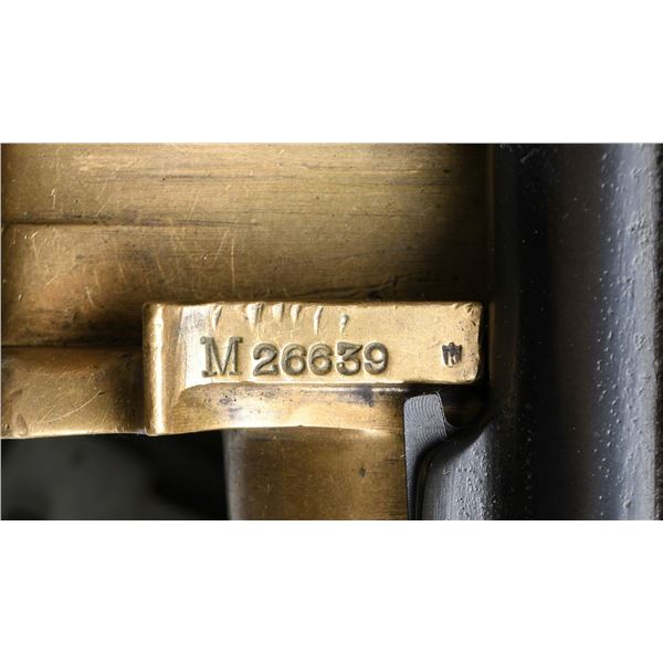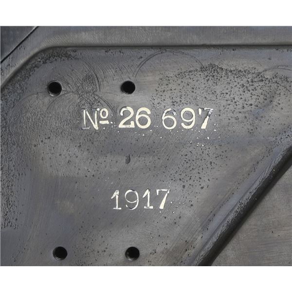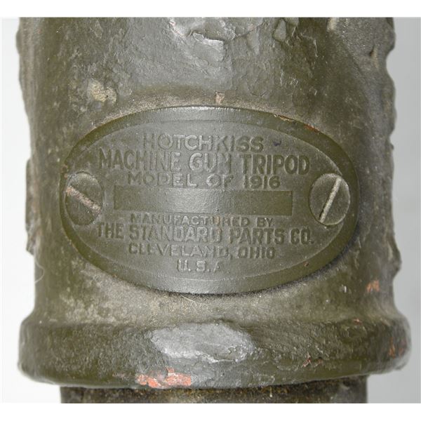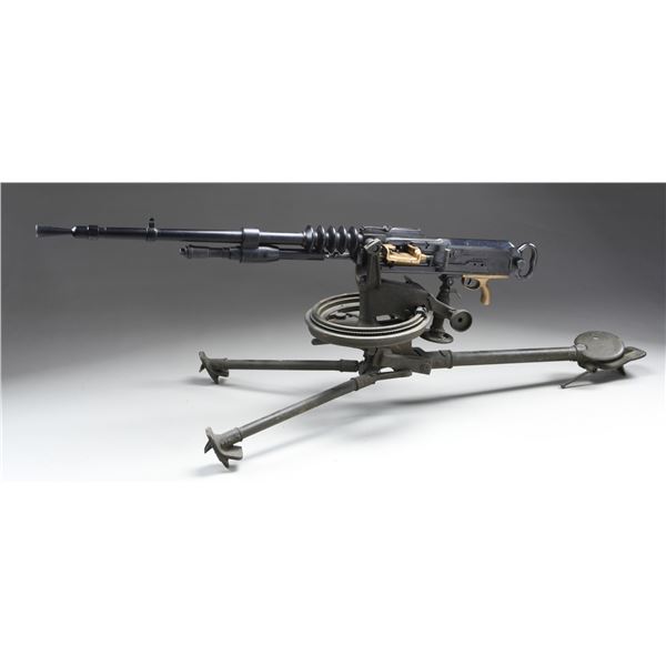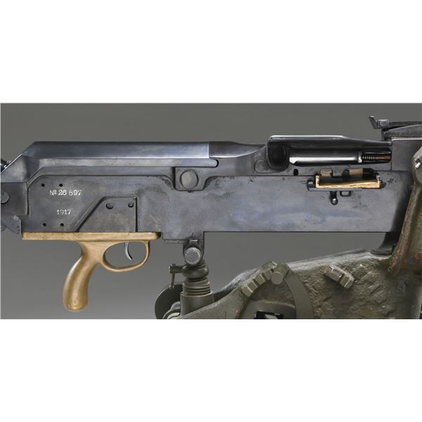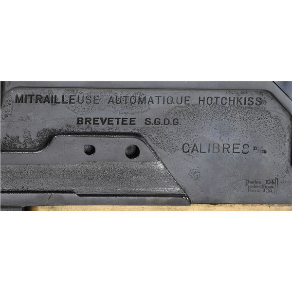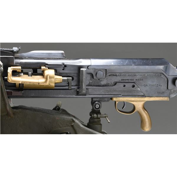 MITRAILLEUSE AUTOMATIQUE MACHINE GUN. CURIO. Cal. 8mm (8mm Lebel). S# 26697. Bbl. 30 1/2" with five cooling fins. Wide front sight that is missing its luminous insert. Balle D marked rear sight graduated to 2000m. 1917 dated example of the famous strip-fed French WW1 M1914 Hotchkiss heavy machine gun. The M1914 was widely used by French forces & the American Expeditionary Force during the Great War. Hotchkiss machine guns are renowned for their simplicity & reliability. Right side of receiver has 1917 date & serial number. Left side of receiver marked "MITRAILLEUSE AUTOMATIQUE HOTCHKISS / BREVETEE S.G.D.G. / CALIBRE 8 M/M" & with Charles Erb bullet logo. Several markings exhibit added white highlight making the markings standout. Gun is listed as caliber 8mm with Charles Erb as mfr. on registry. Receiver & top cover have matching numbers. Brass feed tray numbered "M26639". Bbl. serial number is faint & mismatched. Bbl. assembly has black enamel arsenal type finish. Gun is mounted on an American Standard Parts Co. tripod with green enamel paint. CONDITION: brass parts are a dull yellow color with some oxidation staining. Balance of metal retains about 60% arsenal rework type blue & black enamel finishes with scattered finished over pitting, fading to brown & flaking enamel. Action functions properly when hand cycled. Very good bore with strong rifling. Tripod shows expected age wear with flaking & oxidation. Traverse & elevation adjustments work when hand cycled. PROVENANCE: From the Lifelong Collection of Brian Linde. NATIONAL FIREARMS ACT MG REQUIRING BATF TRANSFER BEFORE TAKING POSSESSION. FULLY TRANSFERABLE. (03-1823/MJC). MODERN CLASS III. $10,000-15,000.