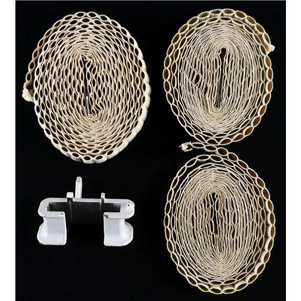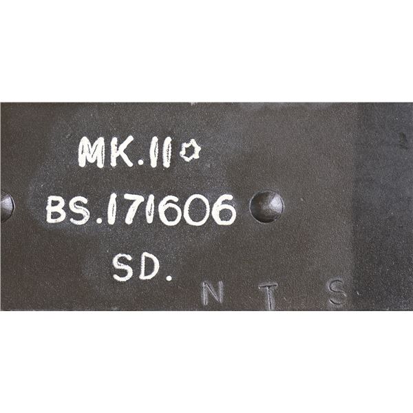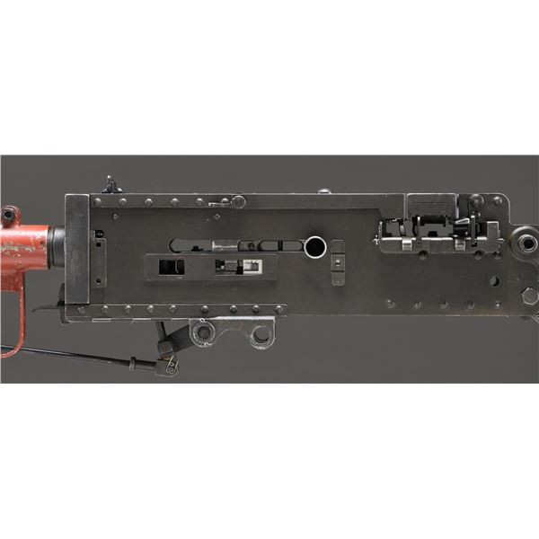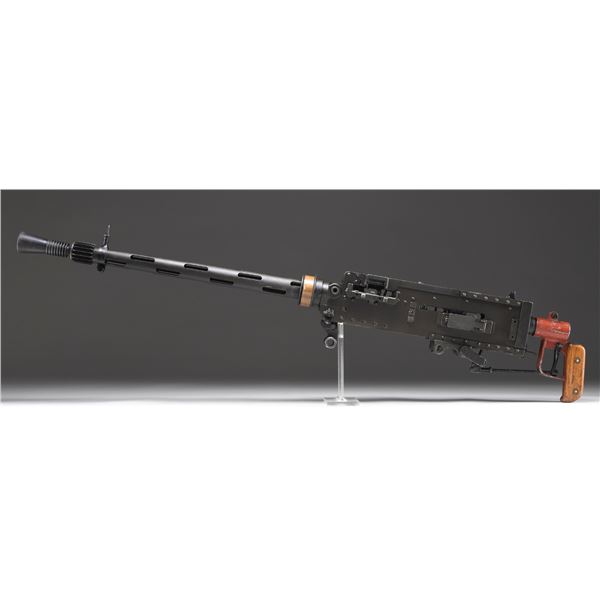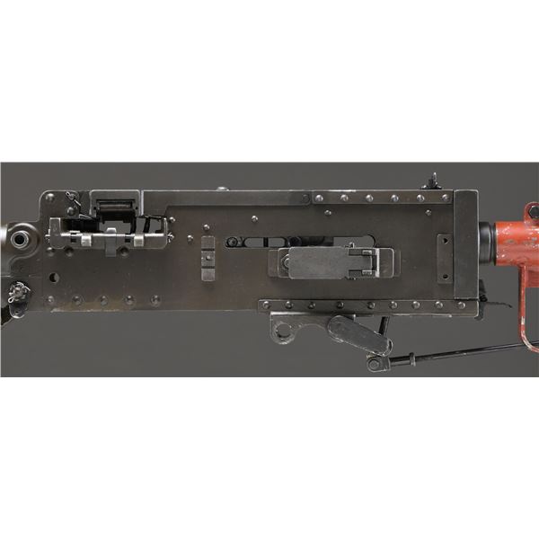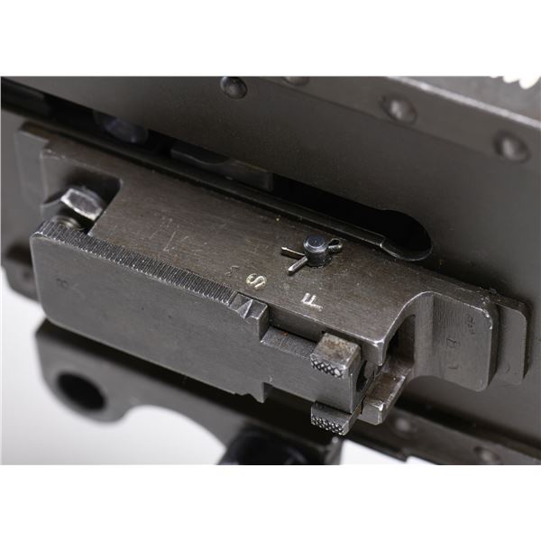MK II (FLEX) HEAVY MACHINE GUN. CURIO. Cal. 303. S# BS171606SD. Bbl. 24". A British Aircraft version of the Browning machine gun. The MKII, chambered in .303 British, was the standard aircraft gun used by the British in WWII. Heavily modified from the early 1930 pattern, belt fed, Colt Browning machine gun, the British redesigned their MKII to fire from an open bolt. It had an incredibly high rate of fire compared to the much more common Browning family of belt feeds. It currently utilizes a single spade grip & is configured for left hand feed, though it is convertible to right or left. US 30-06 links maybe used to feed the MKII though they must undergo a large amount of modification first. It is perhaps easiest fed when utilizing the cloth US 30-06 belt. In order to utilize this aircraft gun in a ground mount capacity it is cocked utilizing a stubby short charging handle on the right side of the gun, while RAF gunners had the luxury of utilizing a cable based charging system for official use. The barrel jacket is slotted for cooling & it is currently equipped w/ the special MKII flash hider. The sight radius is 32" in length & consists of an exposed front pin & a rear notch sight. Finish on all exterior metal surfaces is dark & parkerized. MAGS: 3 US cloth belts. UNATTACHED ACCESSORIES: external feed chute adapter, painted white. CONDITION: this is a truly remarkable & exciting original example of an uncommon WWII machine gun. An original C&R transferable example that is as at home on a firing line w/ its incredibly high cyclic rate as it is in the few museums where they reside. The parkerized finish coverage is complete & consistent w/ only a little thinning in a few areas. The original markings are deep, bold & easy to read, filled w/ white for a sharp contrast. Bore grooves a little dark but retains extremely strong rifling. Fire control mechanism appears to function correct when cycled by hand. THIS IS A NATIONAL FIRARMS ACT LMG REQUIRING BATF TRANSFER BEFORE TAKING POSSESSION. FULLY TRANSFERABLE. PROVENANCE: From the Lifelong Collection of Brian Linde. (03-1814/JZ). CURIO. CLASS III. $8,000-12,000.