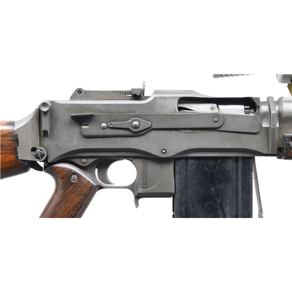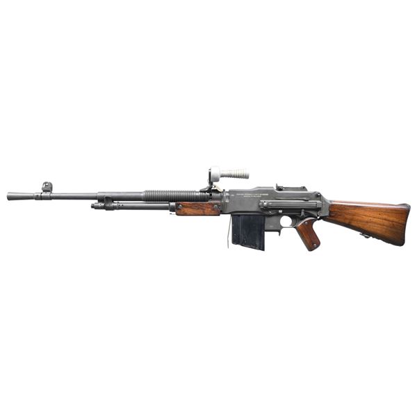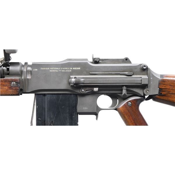 LUXEMBORG CONTRACT FN MODEL D . Cal. 30-06. S# 229. Bbl. 25" over flash hider. Introduced in 1932, the FN Model D was the last version of the legendary Browning Automatic Rifle. It boasts a detachable barrel & eased takedown due to a hinged butt stock, making the rear of the receiver accessible. This particular example was manufactured in Belgium for sale to Luxembourg, and marked as such w/ the "AL" marking on the top front of the receiver. Unlike the traditional BAR, the FN Model D has a pistol grip, similar in aesthetics to the Colt Monitor. Above the pistol grip is the safety / selector marked "M - R - S". The internal design utilizes a rate reducer allowing full auto function at a slower cyclic rate. The "S" position is "Safe", the "R" position is "Slow" & the "S" position is "Fast". Belgium proof marks on left side of receiver. Matte parkerized finish on exposed metal surfaces. 2 piece wooden forend w/ matching 2 piece pistol grip panels & shoulder stock w/ folding shoulder rest. Shoulder stock also inlet for rear mounted monopod. Serial number on trigger group "229" matches receiver number. Top mounted carry handle that assists w/ barrel changes. Protected blade front sight. Rear peep sight adjustable from 100 meters to 1500 meters. Detachable barrel has 30 cooling fins forward of chamber. Barrel marked w/ British & Belgian proof marks. MAGS: 7 steel 20 rd. CONDITION: Finish complete & consistent w/ very little outward sign of use. Finish coverage unusually complete w/ some light thinning in areas of mechanical intervention & on some high spots. Bipod & front gas port absent as well as rear right forend screw. Wood furniture is in nice condition but shoulder stock has a few 3.5" hairline cracks that don't appear to have any structural significance. Bore is bright w/ strong rifling. Fire control mechanism appears to function correctly when cycled by hand. PRE-86 DEALER SAMPLE (KEEPER). NATIONAL FIREARMS ACT MG REQUIRING BATF TRANSFER BEFORE TAKING POSSESSION. YOU MUST BE A CURRENT NFA/SOT DEALER IN ORDER TO TAKE POSESSION OF THIS FIREARM. PROVENANCE: From the Lifelong Collection of Brian Linde. (03-1838/JZ). MODERN.CLASS III. $8,000-12,000.