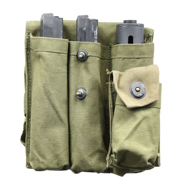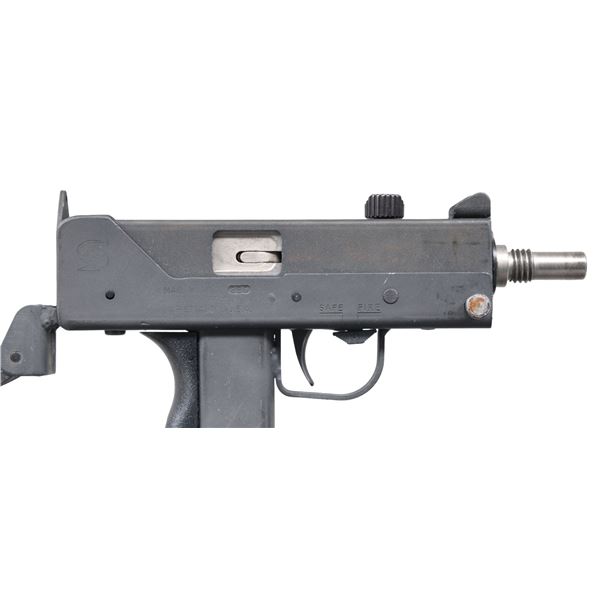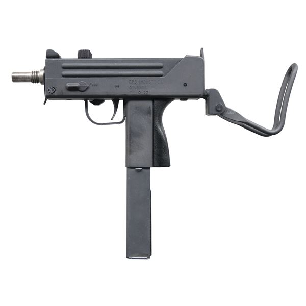 Cal. 380 ACP. S# A13. Bbl. 5". From its introduction, to the legislative imposed cutoff of 05-19-1986 the M-11 series guns were a popular & affordable entry level SMG. It's low price was only rivaled by its reliability & these little bullet hoses continue to perform just as well several decades later. RPB's entry into the "Micro Mac" semiautomatic pistol market was the tiny M11-A1, open bolt pistol, chambered in .380 ACP. It was designated the M11-A1 so as not to be confused w/ their popular 9mm, M11 Submachine Gun. While the traditional MAC 10 or even the 9mm M-11 were generally considered "boxey" or "chunky" in design, the M11-A1 pistol & M11 380 SMG was similar in size to the Colt 1911, though not quite as ergonomic in design. The suppressor users enjoyed the M11 380 since ammo was already subsonic, just like the 45ACP and provided a very low sound signature when fired. This particular example has a dark gray parkerized finish. Protected post front sight. Rear peep sight is a hole drilled in the rear receiver extension to coincide w/ the front sight. Collapsible, folding shoulder stock. Slotted charging knob provides an unobstructed view. The action is locked by rotating the charging knob 90-degrees in the closed position. Safety is located on the right side of the receiver, inside the trigger guard. Threaded barrel w/ strap hanger. The familiar snake logo appears on the right rear of the lower receiver. Blowback operated, open bolt, select fire action. MAGS: 3 steel 30 rd. UNATTACHED ACCESSORIES: Green cloth mag pouch, 7" slotted barrel extension, & correct mag loading tool. CONDITION: finish on exterior metal surfaces enjoy complete coverage w/ some light thinning on high spots & on areas of mechanical intervention Bore is bright w/ strong rifling. Fire control mechanism appears to function correctly when cycled by hand. NATIONAL FIREARMS ACT SMG REQUIRING BATF TRANSFER BEFORE TAKING POSSESSION. FULLY TRANSFERABLE. (03-1764/JZ). MODERN CLASS III. $6,000-9,000.