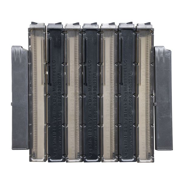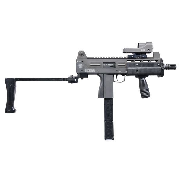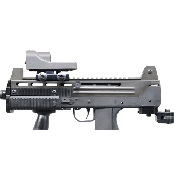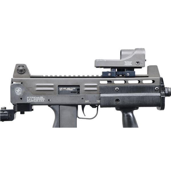 CONVERSION & TRIJICON REFLEX SIGHT. Cal. 22LR. S# 86-0013013. Bbl. 9.75". The younger brother of the infamous MAC-10 may not have moved out of it's shadow as far as Hollywood movies & urban legend is concerned, but as far as becoming a commonly owned civilian SMG, it may actually have taken the top spot. From its introduction to the legislative imposed cutoff of 05-19-1986 the M11 was a popular & affordable entry level SMG. It's low price was only rivaled by its reliability & these little bullet hoses continue to perform just as well several decades later. This particular example mfg. by SWD of Atlanta GA was manufactured in 1986. The company name was an acronym for Silvia Williams Daniel, the prior spouse of Wayne Daniel who owned the manufacturing rights to the Ingram Model 11 as well as the popular Cobray trademark. This particular example has been heavily modernized and upgraded w/ a LAGE Mfg. Max-11/22 kit consisting of a lengthened upper receiver that provides a 10" picatinny rail for mounting options currently sporting a Trijicon Reflex sight. Instead of the original post & peep system the sights have been upgraded to an elevation adjustable protected post front sight & a windage adjustable, dual aperture rear peep sight. A1 style flash hider for aesthetics. Vertical front foregrip. Left side folding shoulder stock. Matte gray parkerized finish on exposed metal surfaces. Left side, non-reciprocating charging handle on upper receiver. Left side selector switch. Right side safety parallel to trigger guard. The familiar Cobray snake logo appears on the right rear of the lower receiver. Open bolt, blow-back operated, select fire action. Factory engravings have been highlighted in white for contrast & are easy to read. MAGS: 8 Black Dog 40rd. .22lr. & 2 steel 30 rd 9mm. UNATTACHED ACCESSORIES: M11/9 Lage bolt, original 9mm barrel & strap, original M11/9 fire control parts, Mac-Jack. CONDITION: Parkerized finish on exterior metal surfaces enjoys complete coverage w/ only a few light drag lines & thinning on some high spots. Bright bore w/ visible rifling. Fire control mechanism appears to function correctly when cycled by hand. NATIONAL FIREARMS ACT MG REQUIRING BATF TRANSFER BEFORE TAKING POSSESSION. FULLY TRANSFERABLE. PROVENANCE: From the Lifelong Collection of Brian Linde. (03-1827/JZ). MODERN CLASS III. $6,000-9,000