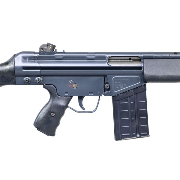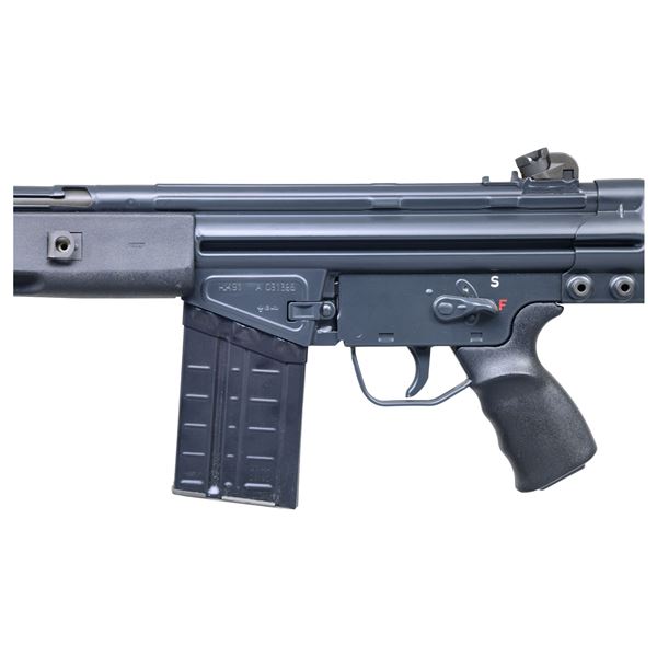 TARGET & MAGS. Cal. 308. S# A031386. Bbl. 17.7" w/ factory flash hider. Standard A-2 model w/ black plastic stock set. Factory 4 position drum style rear sight assembly. Hooded post front sight. Push button mag. release w/ S-F metal clip on trigger housing. Mag. well right side marked, "Made in Germany, HK Inc., Arl. Va. 22- 201". Left side mag. well marked, "HK91 A031386", & eagle IB antler indicating 1981 manufacture. MAGS: 4 steel 20 rd & 2 aluminum 20 rd. .UNATTACHED ACCESSORIES: Factory box, paperwork, test target, cleaning kit & sling. CONDITION: All aspects indicate very little use, if any. Factory paint on all exposed metal surfaces remains consistent & correct. No visible thinning in areas that wear fast due to mechanical intervention. Furniture free of any noticeable outward defect. Bore is bright w/ well pronounced rifling. Fire control mechanism appears to function correctly when cycled by hand. (25-799/JZ). MODERN. $3,000-4,000.