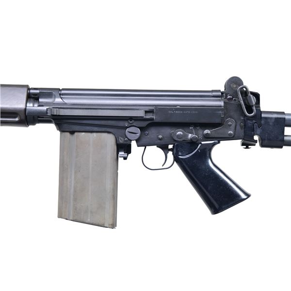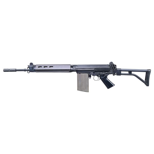 Cal. 7.62 NATO. S# S1596031. Bbl. 18" with flash hider. Post front sight with protective ears. Flip up aperture rear sight. Scarce M44 Paratrooper FAL with only 1375 imported before 1989 ban. Right side of mag well has HOWCO import marking. Right side of upper receiver has FN & Guns South markings. Serial number has added yellow highlight. Black enamel finish. Folding stock with composite pistol grip & handguard. Left side sling swivels. MAGS: 2-20 rd. both metric. UNATTACHED ACCESSORIES: aftermarket black hardcase. CONDITION: furniture shows some handling marks & light wear. Metal retains 95-97% original finishes with some light flaking most notably behind ejection port & a few handling marks. Action functions properly when hand cycled. Near excellent bright bore. (25-1002/MJC). MODERN. $4000-6000.