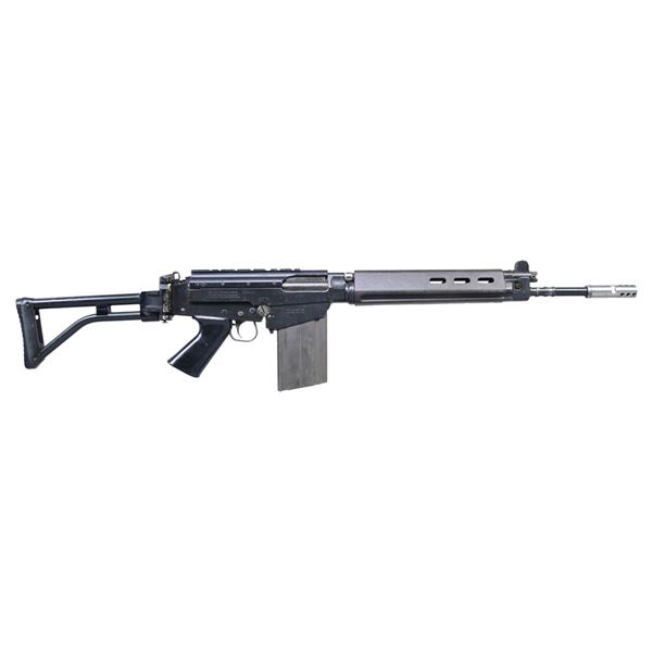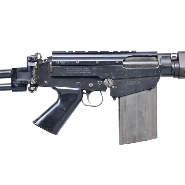 RIFLE. Cal. 7.62 NATO. S# S1596517. Bbl. 18" with flash hider. Post front sight with protective ears. No rear sight present. Upper has full length Weaver style scope mount. Scarce Paratrooper style FN made FAL rifle with only 1375 imported before 1989 ban. Right side of mag well has Howco import marking. Right side of upper has FN & Gun South markings. Black enamel finish. Flash hider has a bright appearance. Folding stock. Green colored handguard & black pistol grip. MAGS: 2-20 rd. metric. UNATTACHED ACCESSORIES: black aftermarket hardcase with FAL manual, dual mag pouch, Austrian cleaning kit, FN speed loader & tubular bayonet with scabbard. CONDITION: pistol grip & handguard show some dings, scattered flaking & handling marks. Stock shows scattered flaking enamel with some oxidation. Flash hider has a bright cleaned appearance with some pitting & remnants of black enamel finish. Balance of metal shows scattered bubbling finish, light oxidation & some flaking. Action functions properly when hand cycled. Bright very good + bore with strong rifling. (25-987/MJC). MODERN. $3500-5000.