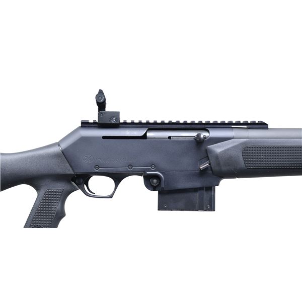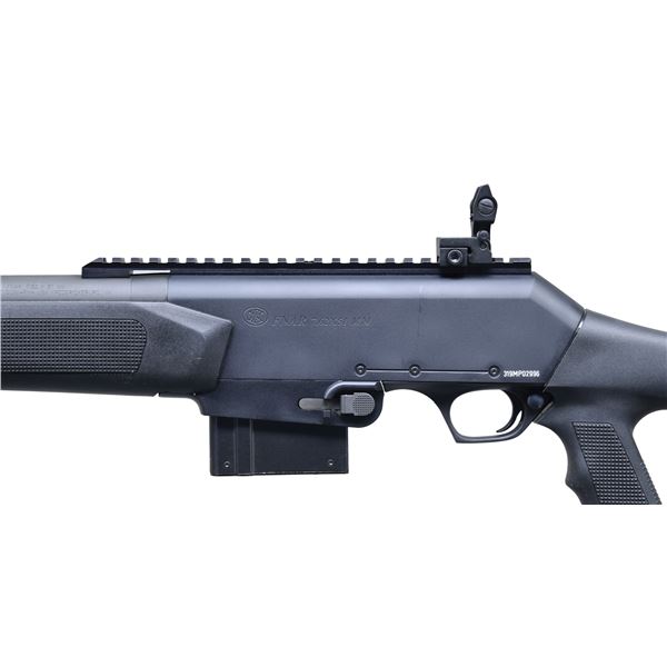 Cal. 7.62x51. S# 319MP02996. Bbl. 21" fluted. Flip up sights. Receiver mounted picatinny rail for scope mounting. Tactical version of the FN BAR semi auto rifle. Matte black & gray finishes. Black synthetic pistol grip stock with unmarked recoil pad & checkered forend with three picatinny rails. LOP: 14 1/4". MAGS: 2-20 rd. & 1-10 rd. Total of 3. UNATTACHED ACCESSORIES: factory hardcase. CONDITION: stock set shows scattered light handling wear. Metal retains 95% original matte finish with some scattered handling & edge wear. Action functions properly when hand cycled. Near excellent bore. (25-802/MJC). MODERN. $1,500-2,250.