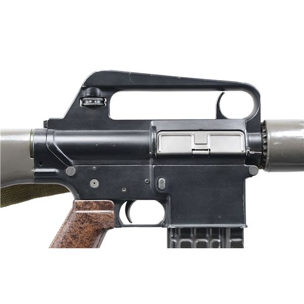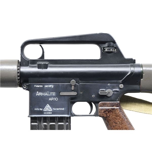 ARMALITE AR-10 SELECT FIRE RIFLE. Cal.7.62 NATO. S# 003092. Bbl. 20" The most popular modern sporting rifle in the United States is absolutely the AR-15. The Granddaddy of this rifle is the AR-10, chambered in 7.62 NATO & manufactured in the mid 1950's. It was adopted by several military units, outside the United States including Sudan, Portugal & even Cuba. ArmaLite licensed manufacturing rights to a Dutch manufacturer called Artillerie-Inrichtingen (A.I.) in 1957 where they were primarily manufactured in the early 1960s. Despite substantial sales to the governments of Sudan & Portugal, logistical problems would soon cause manufacture to cease & the focus would come back to the United States in the development of the successor, the AR-15. This example is an original Armalite AR10 manufactured in the Netherlands. Since it was a machine gun, imported into the United States after 1968, it is classified by the BATF as a "Pre-86 Dealer Sample", often referred to as a "Keeper", since it can be owned by an individual, as long as it was purchased while holding an FFL / SOT. Dark black finish on all exposed metal surfaces. Barrel is terminated w/ ventilated 3 prong flash hider forward of bottom mounted bayonet lug w/ correct ventilated barrel shroud. Tall, protected blade front sight coincides w/ adjustable peep sight mounted inside the rear of the carry handle. Rear sight wheel is marked w/ numbers ranging from "1" to "6". Charging handle resides between carry handle & receiver, directly above the dust cover. What appears to be Dark brown synthetic furniture has been painted greyish green on the forend & shoulder stock. The pistol grip retains the original brown color., which has a Bakelite look to it. Metal buttplate incorporates functional trap door. No forward assist or brass deflector behind spring assisted dust cover. Slab side lower receiver marked on mag well on left side; "PATENTS PENDING / ARMALITE / AR10 / MFD BY NEDERLAND" w/ logo & serial number. Safety selector marked; "Auto-Safe-Semi" on left side of lower receiver. Sling swivels, front on left side & rear on bottom of shoulder stock, currently sporting tan canvas sling. MAGS: 5 waffle pattern 20 rd. marked "ArmaLite Patents Pending" on floorplate. CONDITION: finish coverage is complete & consistent w/ very little sign of use. Thinning is minimal, even in areas of mechanical intervention. Makers markings filled w/ white for contrast, making them easy to read. Furniture, particularly the front handguard, presents a few gentle impressions, which isn't uncommon due to the fragility of the material used at the time. Bore is bright w/ strong rifling. Fire control mechanism appears to function correctly when cycled by hand. PROVENANCE: From the Lifelong Collection of Brian Linde. PRE-86 DEALER SAMPLE (KEEPER). NATIONAL FIREARMS ACT MG REQUIRING BATF TRANSFER BEFORE TAKING POSSESSION. YOU MUST BE A CURRENT NFA/SOT DEALER IN ORDER TO TAKE POSESSION OF THIS FIREARM. (03-1836/JZ). MODERN. CLASS III. 6,000-10,000.