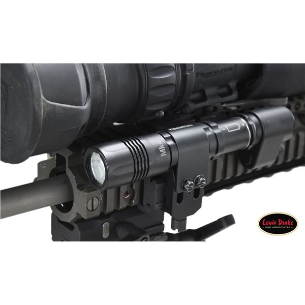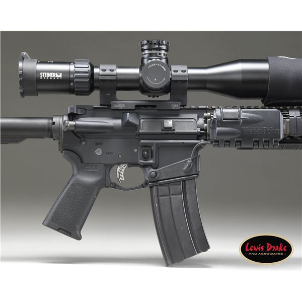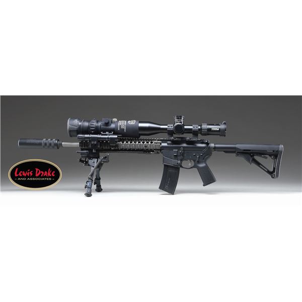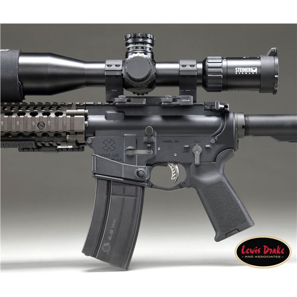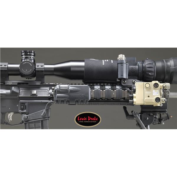existence in this caliber and configuration) NOVESKE N4 RPS RIFLE WITH RARE TRIGGER POINT RAIL SYSTEM, STEINER DBAL-A³ & KNIGHT'S WHITE PHOSPHOR UNS LR LP AN-PVS30 ENHANCED NIGHT SCOPE & ELITE IRON "BATTLEDOG" SUPRESSOR. Cal. 6.8MM. Rifle S# X14700 / Suppressor S# BD143. . Bbl. 16.5". Here is an opportunity to own a top of the line weapon system (only two in this caliber so equipped known to exist) that will be the envy of your shooting buddy's. The rifle alone, the Noveske N4 is an extremely desirable piece, and it is just the base unit for this amazing system. This example has been topped w/ World Class optics & modern electronic technology for use day or night, over 1000 yards away from your intended target. Rifle has a non-reflective matte black finish on all exposed surfaces, left side safety / selector & a flat top upper receiver w/ brass deflector & forward assist. It is currently sporting a quad rail w/ a Trigger Point Technology T.R.A.M.S. system to enhance operation of the mounted accessories. The Tactical Rail Accessory Management System allows trigger finger activation of any selected light, laser, or combination by simply engaging the trigger, or pushing the button your trigger finger is close to. Currently sporting a Steiner Military 3-15x50mm scope w/ Horus Tremor Three reticle on LaRue OBR QD mount. Forward of the scope is a Knight's Armament Company Gen. 3, AN/PVS-30 Universal Night Sight Long-Range (UNS LRLP A1) clip-on weapon sight. It is augmented by the inclusion of a Steiner DBAL-A³ Dual Beam Aiming Laser mounted on the right side. On the left side is a Steiner MK4 weapon light. All are controlled by the Trigger Point system and functional w/ the engagement of the Geissele Super Select Fire Trigger specially modified by the Geissele factory for this firearm, or the push of a single button by your trigger finger. 6 position collapsible shoulder stock w/ additional QD socket at rear. Harris bipod w/ telescoping legs, adjustable between 6" to 9" in height w/ quick detachable RBA-1 Adapter. MAGS: 1 steel 30 rd. CONDITION: Finish is complete & consistent w/ only a few very faint drag lines as the only real signs of use. Optic glass is clear w/ sharp reticle. Trigger point system all wired for DBAL & visible light w/ no loose cables All electronics appear to function as intended. Bright bore w/ strong rifling. Fire control mechanism appears to function correctly when cycled by hand. PROVENANCE: from the renowned collection of quality sporting arms from Lewis Drake together with inventory of Lewis Drake Associates. NATIONAL FIREARMS ACT SOUND SUPPRESSOR REQUIRING BATF TRANSFER BEFORE TAKING POSSESSION. FULLY TRANSFERABLE. (03-1860 / 24-7093/JZ). US SALES ONLY. NO EXPORT. MODERN CLASS III. $18,000-28,000.