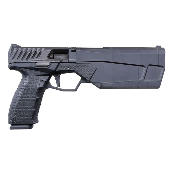 Cal. 9mm. S# MX9-1577 & M9-1627. Bbl. 4". An interesting, innovative striker fired, polymer frame pistol w/ an integral sound suppressor. Unlike most other integrally suppressed pistols, the Maxim 9 doesn't only extend the barrel, but the signature of the frame as well, to increase volume without overly increasing the length. The suppressor length can be increased or decreased based on the function & form desired. Matte black finish. Polymer frame left side controls & lightly stippled grip surface. Aggressively serrated slide for assistance in charging. Fixed, 3-dot sights. 3" Keymod section below barrel for accessory mounting. Top of slide has an adapter plate for red dot mounting. This system utilizes standard Glock Model 17 mags. MAGS: 1 Glock 17 rd. UNATTACHED ACCESSORIES: Factory box, paperwork. CONDITION: Finish complete & consistent w/ only gentle outward sign of use in the form of thinning on high spots. Internals display typical carbon buildup for suppressed firearms but displays a bright bore w/ strong rifling. (03-1857 / 24-7094/JZ). MODERN. CLASS III $400-600