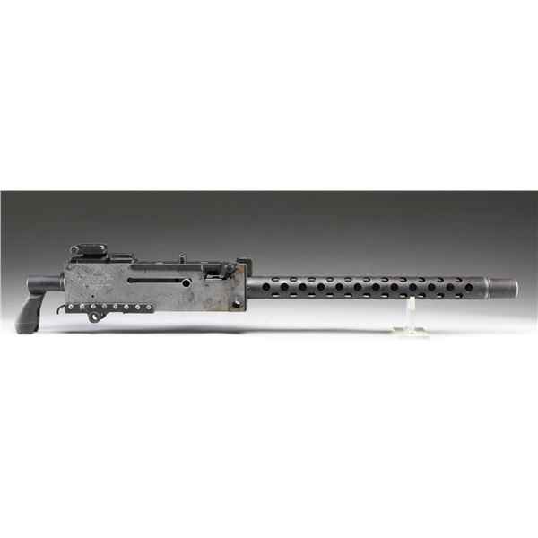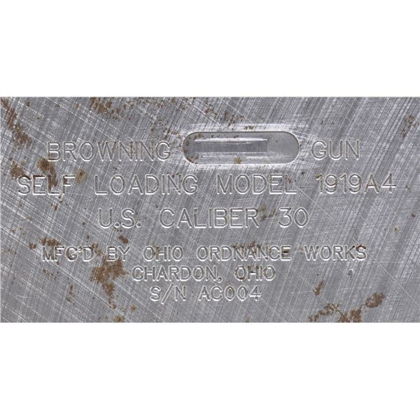 ORDNANCE SIDEPLATE. Cal. 308. S#. AC004. Bbl. 24". There aren't many firearms from the military past of the United States that are as recognizable as the rectangular receiver & perforated barrel shroud of the Browning model 1919. In order to own a legal machine gun there are fees & a fairly lengthy amount of paperwork that aren't necessary for traditional, Title I firearms like hunting & target rifles. This particular Browning sideplate was manufactured by Ohio Ordnance Works & based on the war proven, original, as a functional semi auto only. This gives you the opportunity to own such an exciting piece of history w/ out the extra time & expense. This firearm transfers just like any other semi auto firearm. Rear of the iconic, circular vented barrel shroud is the front sight, a folding post, w/ an elevation adjustable ladder rear sight, marked out to 1500 yards. It may be fired utilizing a 1919A6 style bipod (not included) or mounted to a tripod w/ a proper cradle assembly. It currently appears to be chambered in 7.62 NATO w/ the proper bolt & bbl. assembly. Common chamberings for this system can include 7.62 NATO, 8 mm Mauser & U.S. 30-06. Parkerized finish on all exposed metal surfaces, aside from the right sideplate, which is unfinished.. Right sideplate markings include: "BROWNING GUN./ SELF LOADING MODEL M1919 A4 / U.S. CALIBER 30 / MFG'D BY OHIO ORDNANCE WORKS / CHARDON, OHIO / S/N AC004". Original parts kit of unknown origin though several parts include Israeli markings which would be common for military .308 chambered military surplus parts. CONDITION: Finish appears original on all parts, retaining complete coverage, aside from right sideplate, which is still unfinished. Everything appears functional & correct though unable to confirm through live fire exercises. Bright bore w/ strong rifling. Fire control mechanism appears to function correctly when cycled by hand. PROVENANCE: Lifelong Collection of Terrence McCarty. (24-90/JZ). MODERN. $2,000-$3,000.