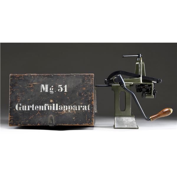 BELT LOADER. An early, brass variation of the MG51 Swiss belt filling machine for the MG11 machine gun. It appears to be an updated version, used for the later metal, articulated, non-disintegrating belts that replaced the earlier cloth belts between 1934-1935. Parts constructed of brass painted OD Green, while steel parts are painted matte black. Loader is designed to mount on desk or bench, or even the included transit crate if more desirable. Housed in an original wood transit chest measuring 12.25" x 14.25" x 9", stenciled on top; "MG51 / GURTENFÜLLAPPARAT". CONDITION: Painted finish retains full coverage. Brass surfaces retain stampings and are easy to read. All aspects indicate little or no prior use. All moving parts are smooth and fluid. PROVENANCE: From the Lifelong Collection of Brian Linde. (02-23926-5/JZ). $200-400.
