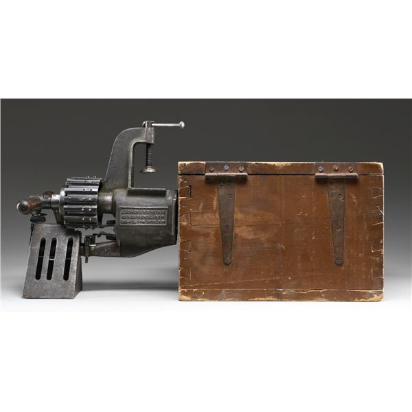DWM made Gurtfuller 16 or MG-08 belt loader. Body is numbered "80332" & hopper is numbered "2385". Unmarked wooden crate present. CONDITION: metal is mostly a gray patina with scattered oxidation & traces of what appears to be German feldgrau paint. Wooden handles show scattered dings & flaking. PROVENANCE: From the Lifelong Collection of Brian Linde. (02-23926-12/MJC). $1000-1500.