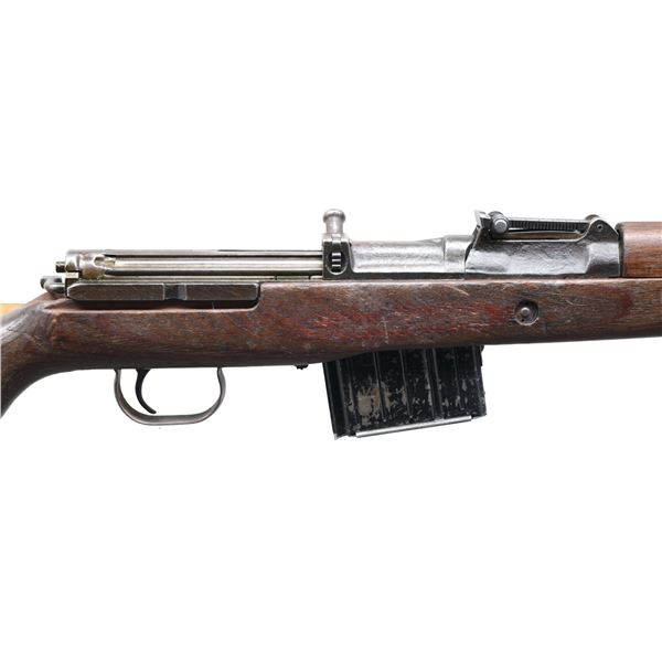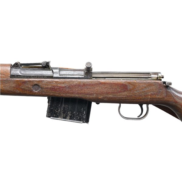 Cal. 8x57 (8mm Mauser). S# 4649l. Bbl. 22". Blade front sight without hood. Tangent rear sight graduated to 1200m. Mismatched bolt assembly. No dust cover present. Late war Berliner Lubecker made K43 semi auto rifle. Left side of rear sight base marked "K.43 qve45". Gas cyl. has electropencil number that is mismatch. Phosphate finish. Laminated stock & handguard. Stock number is faint & illegible along with other German markings. Recoil lug has St. Etienne "251" Waffenamt. Left side side sling provisions with repro tan sling. Replacement cleaning rod present. Right side of butt has carved "R" denoting post-war French border guard use. Both sides of butt have some added other indiscernible carvings. MAGS: 1-10 rd. marked "gcb" & "K43". CONDITION: stock set has arsenal rework appearance with repaired crack behind action running into left side of wrist, a few long handguard cracks, a couple other smaller cracks, some chipping, scattered dings, handling marks & scratches. Metal is mostly a silvery-gray patina with scattered oxidation & traces of phosphate finish. Action is a bit sluggish but functional when hand cycled. Worn bore with scattered oxidation & pitting but evident rifling. PROVENANCE: the Estate Collection of Charles Wagner. (24-4617/MJC). CURIO. $2000-3000.