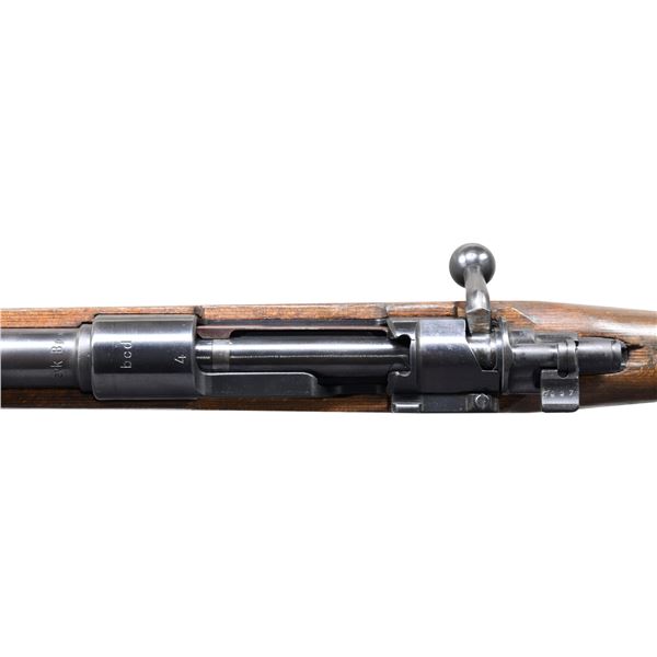 SNIPER RIFLE. Cal. 8x57 (8mm Mauser). S# 14692. Bbl. 23 1/2". Blade front sight without hood. Tangent rear sight graduated to 2000m. All visible parts are unnumbered or mismatched with bolt being scrubbed. Rifle has correct thick sidewall with three holes & was likely an unfinished long side rail example. Bolt has standard K98k safety not sniper "Key" safety. Receiver top marked "bcd 4" for Gustloff Werke. Front of trigger guard has "GERMANY" import marking. Locking screws are missing. Reblued finish. Laminated stock set with left side sling provisions. No cleaning rod present. CONDITION: stock set shows a long laminate split on underside of butt, a couple other laminate cracks, some abrasions around butt, scattered dings & handling marks. Metal retains 90% commercial reblue with some blued over pitting, edge wear, fading & light oxidation. Action functions properly when hand cycled. Worn pitted poor bore. (25-490/MJC). CURIO. $1200-1800.