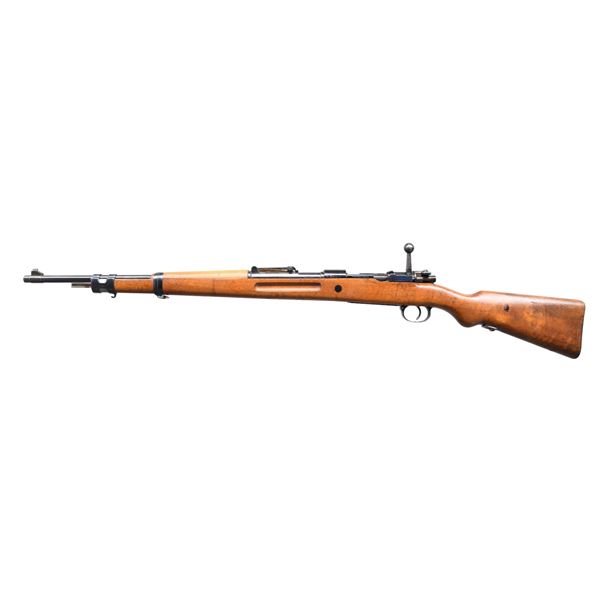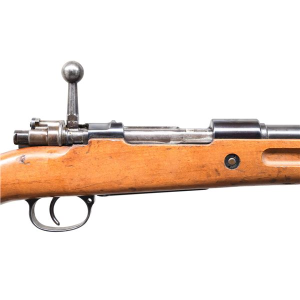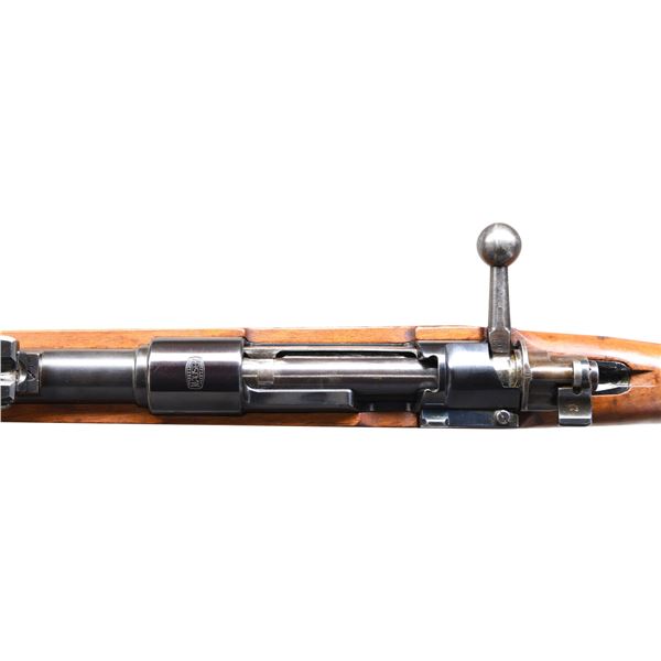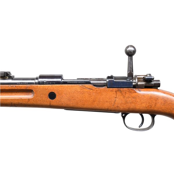 MILITARY RIFLE. Cal. 8x57 Mauser. S# B59363. Numbers match on the receiver, bbl., and trigger guard. Bbl. 23 3/4". This Standard Modell short rifle was produced after 1933, and it was used for police and security duty, as well as being sold worldwide. The receiver ring is marked with the Mauser banner and the left rail is marked "STANDARD-MODELL." Receiver ring also carries the "B G U N" proofs. Replacement bolt with straight bolt handle; bolt is marked underneath with a Weimar eagle. Tangent rear sight, graduated to 2000 meters; inverted V front sight. Bayonet bar is present. European walnut stock set; stock has grasping grooves and bottom swivels. H-type upper band has parade hook. UNATTACHED ACCESSORIES: 9 7/8" fullered blade bayonet. Bayonet is marked on the left ricasso "S/174", marked on the right ricasso "36C, and marked on top of the blade "37." Pommel has two "WAA235" marks. Matching steel scabbard carries markings identical to the bayonet. Bayonet has 60% of its original blue on the blade, with thinning and light wear; the balance of metal is turning gray in patina. Bayonet has been sharpened. Grips have light wear, staining, and several tiny cracks. Scabbard has traces of blue turning gray in patina. CONDITION: stock set has light wear with moderate scattered handling marks, with a notable filled knot in the cheek area. Metal retains a very large percentage of its arsenal-reworked blue finish, with light wear and scattered scratches. Near excellent, shiny bore. PROVENANCE: the Estate Collection of Charles Wagner. (24-4635/RW). CURIO. $800-1,200.