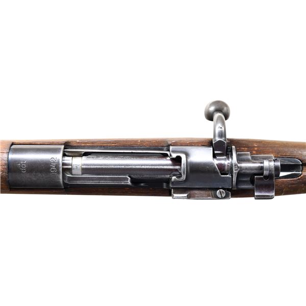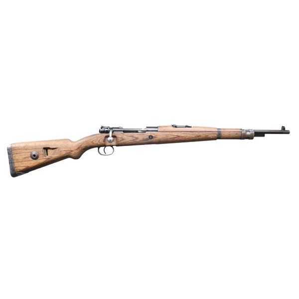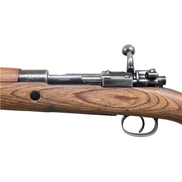 Cal. 8x57 (8mm Mauser). S# 8023c. Bbl. 19 1/4". Blade front sight without hood. Tangent rear sight graduated to 1000m. Mismatched numbers throughout but bolt body & stock are of correct G33/40 type. Receiver top has "dot 1942" marking denoting mfr. by Waffen Werke Brunn I in 1942. Blued finish. Laminated stock set with kick plate & left side sling provisions. Rear band, band spring & cleaning rod missing. CONDITION: stock set shows a few notable cracks on handguard, a few abrasions, scattered dings, flaking & handling marks. Metal retains 40% blue with overall fading to gray, the floorplate having a silvery-gray appearance, a couple small spots of light pitting, some scattered light dings, oxidation & edge wear. Action functions properly when hand cycled. Bore has scattered light pitting & oxidation but strong rifling. (25-474/MJC). CURIO. $2000-3000.