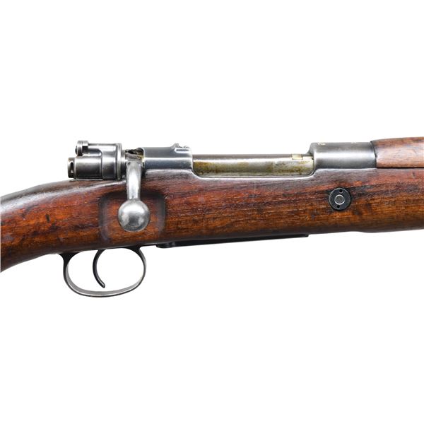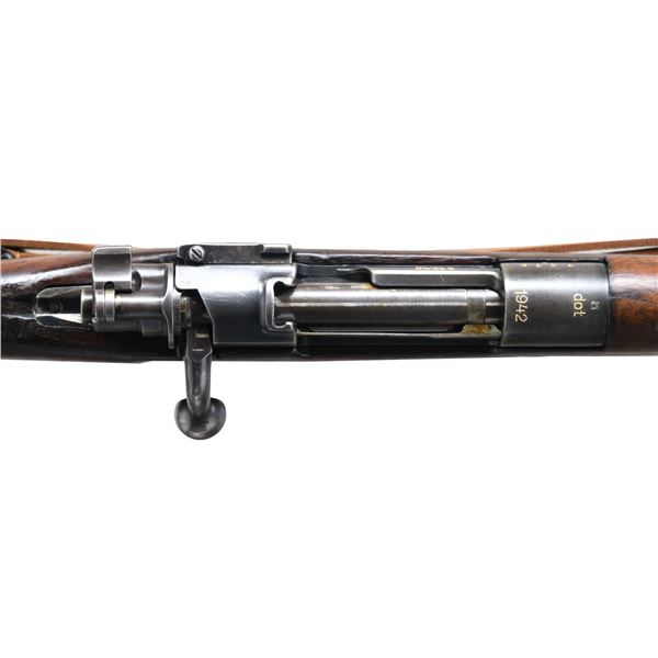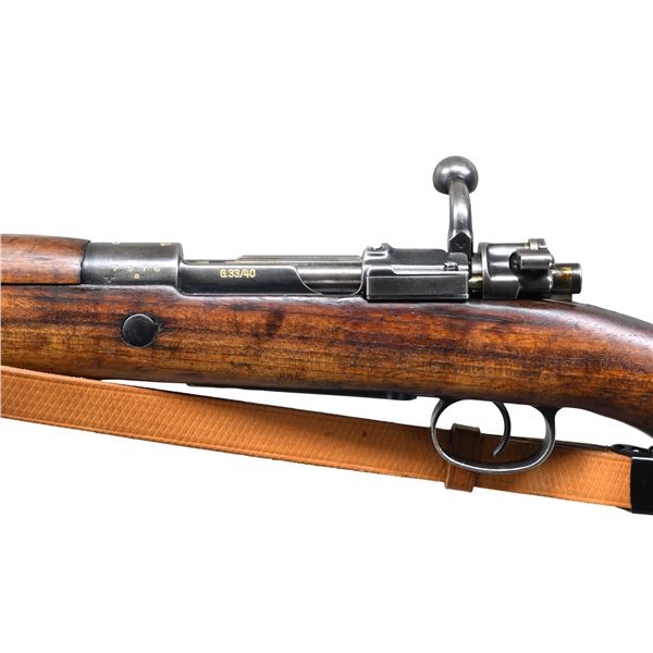 Cal. 8x57 (8mm Mauser). S# 7576a. Bbl. 19". Blade front sight with hood. Tangent rear sight graduated to 1000m. Bolt is from another G33/40 carbine & is mismatched. Receiver top has "dot 1942" markings. Various receiver markings have added white highlight paint. Blued finish. Replacement walnut stock is from an earlier G33/40 & appears unnumbered. Stock markings are very faint. Recoil lug appears setback. Repro leather sling & blued cleaning rod present. CONDITION: stock set has arsenal rework appearance with scattered cracks on handguard, several impression markings on both sides of butt, scattered dings & handling wear. Metal is mostly a gray patina with scattered traces of arsenal blue, some light pitting, oxidation & light dings. Bolt operates very stiffly but properly when hand cycled. Bore shows scattered oxidation & pitting. PROVENANCE: the Estate Collection of Charles Wagner. (24-4626/MJC). CURIO. $2000-3000.