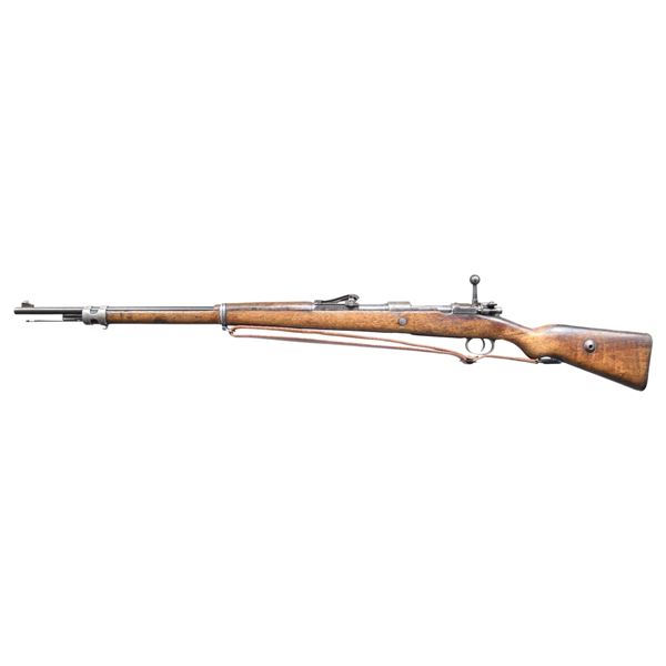 Cal. 8x57 (8mm Mauser). S# 6868p. Bbl. 29". Blade front sight. Lange Vizier rear sight graduated to 2000m. Matching numbers on the receiver, bbl., rear sight, front action screw, trigger guard, floorplate, follower, and front sight. Other parts have mixed numbers, with the bayonet lug being WWII German-marked and the bolt shroud being an unnumbered Czech replacement. Receiver top has an imperial crown and "DANZIG 1915" markings. Receiver and bolt assembly, properly "in the white". Other parts are blued. Replacement walnut stock set with takedown disc. Stock appears to be of non-German mfg. and has an "A" marking on the right side of the butt. Parade sling swivels with a repro leather sling. Chilean replacement cleaning rod is present. CONDITION: stock set has epoxy repair at wrist that is slightly misaligned towards the rear so that there is a space behind the trigger guard assembly plus scattered dings, scratches and handling wear. Receiver and bolt are turning gray with some dings and oxidation. Bands appear bright with scattered oxidation and dings from improper removal. Balance of metal is turning gray with scattered traces of arsenal rework blue, some light oxidation, and dings. Fair bore with scattered frosting and pitting but evident rifling. (24-5935/MJC-NW). CURIO. $300-450.