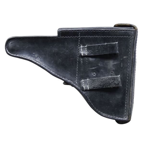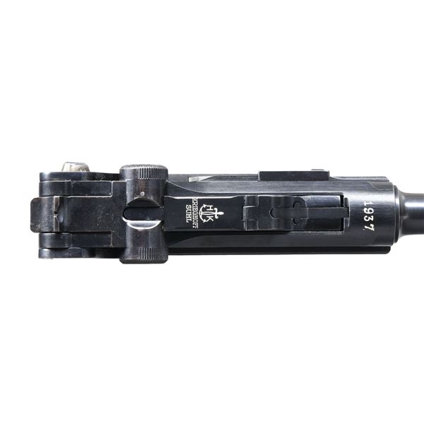 DATE LUFTWAFFE CONTRACT P.08 LUGER SEMI-AUTOMATIC PISTOL WITH HOLSTER. Cal. 9mm Para. S# 9344. Bbl. 4". 1 of only approx. 2,500 P.08 Luger semi-automatic pistols mfg. by Krieghoff in 1937 under contract for the German Luftwaffe. The top of the bbl. extension is marked "1937" over the chamber, with Krieghoff proofs marked on the right. Toggle is marked with Krieghoff's ("H" ANCHOR "K") logo above "KRIEGHOFF/ SUHL". Disassembly shows all small and internal parts with proper Krieghoff acceptance proofs. Major metal components exhibit a lustrous high polish blue finish, with several small parts, including the takedown lever, safety lever, and ejector exhibiting a straw finish. Frame is mounted with 2-piece checkered brown plastic grips. All serialized parts are matching and include the frame, takedown lever (rear), sideplate (interior), trigger, safety lever & bar, bbl., bbl. extension, breechblock, firing pin, firing pin guide, toggles, as well as the rear toggle pin. MAGS: 1 non-matching 8-rd. mag. (S# 7666c). UNATTACHED ACCESSORIES: black leather holster marked with an Eagle/2 on the interior, containing a Eagle/2 loading tool. CONDITION: extremely fine, with metal components retaining bountiful amounts of their original factory blue finish, exhibiting some light edge wear and thinning, some light superficial handling marks, as well as some scattered spots of light surface oxidation. Left side of the bbl. exhibits an area of thinning, with the frame exhibiting a small area of wear at the toe, both consistent with usual holster wear. Strawed parts retain large amounts of their original finish, exhibiting areas of wear and thinning that show through to gray patina, as well as spots of darker age related discoloration. Bright bore, exhibiting streaks of mild to moderate pitting, while retaining strong rifling throughout. Grips are very good, showing light to mild smoothing, as well as some scattered nicks and marks to the diamonds. Holster remains malleable, exhibiting scattered marks from handling and storage, as well as several scratches. An exceptional example of a 1937 dated Krieghoff P.08 Luger, delivered to the Luftwaffe prior to World War II. (24-6884/MLW). CURIO. $6,000-9,000.