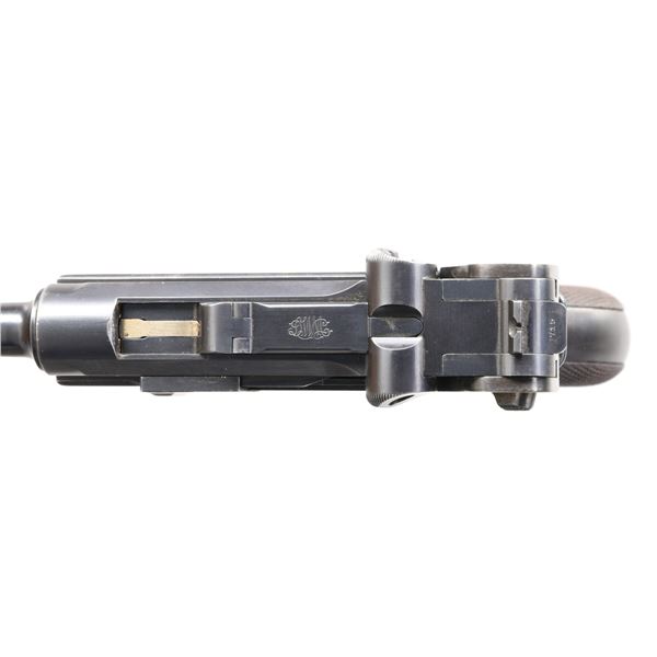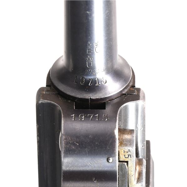PISTOL WITH CUSTOM DISPLAY CASE & ACCESSORIES. Cal. 7.65x21mm Parabellum. S# 19715. Bbl. 4 3/4". Model 1900 Luger, mfg. in Germany by DWM for commercial sales. Toggle is marked with the intertwined "DWM" monogram. Crown over "B", "U", and "G" commercial proofs are present on the underside of the bbl., with Crown over "B" and "U" proofs present on the bbl. extension, breechblock, and forward toggle link. Major metal components exhibit a rust blue finish, with some smaller components exhibiting either a straw or nitre blue finish. Bbl. extension appears to have been reblued at one time. Frame is mounted with 2-piece checkered wood grips. Dished toggles, with anti-rebound arm. All numbers are matching and include the frame, takedown lever, sideplate, trigger, grip safety, bbl., bbl. extension, breechblock, toggles, as well as the grips. MAGS: two 8-rd. UNATTACHED ACCESSORIES: Custom wood display case containing one contemporary mag., a punch tool, and a cleaning rod, as well as a vintage copy of "The Parabellum Automatic Pistol" manual. CONDITION: metal components retain the majority of their original blue finish, exhibiting areas of wear and thinning overall that show through to gray and brown patinas, some scattered flecks of light surface oxidation and/or pitting, as well as some scattered handling marks and dings. Strawed components exhibit varying degrees of wear, with worn areas exhibiting a gray patina, as well as spots of light pitting and age-related discoloration. Bore exhibits consistent dark pitting while retaining fair to good rifling throughout. Grips exhibit some smoothing and some scattered nicks and marks from handling and storage, but otherwise remain sturdy and serviceable. Left grip panel exhibits a chip in the usual area to the rear of the safety lever. Case is very good overall. Manual exhibits age-related discoloration, with some fraying at a few page ends, but otherwise remains sturdy and serviceable. PROVENANCE: from the lifelong collection of Jim Williams. (24-2636/MLW). CURIO. $1,500-2,000.