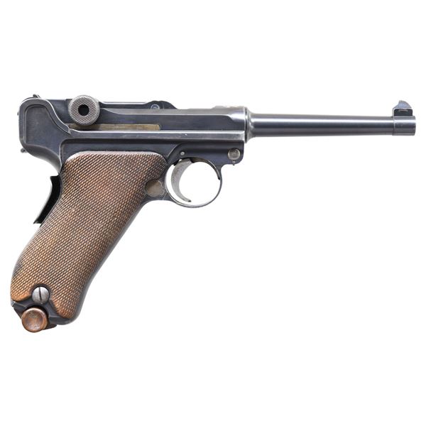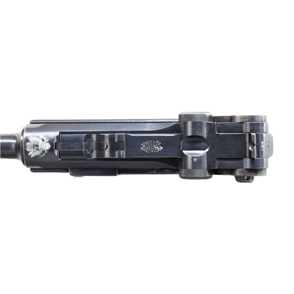 PISTOL, WITH POLISHED SAFETY. Cal. 30 Luger. S# 32123. Bbl. 4 3/4". Model 1906 American Eagle Luger mfg. in Germany by DWM for commercial sales within the USA. Top of the bbl. extension is marked with the Great Seal of the United States, with the intertwined "DWM" monogram marked on the toggle. Front of the frame is marked "GERMANY" below the S#. Metal components exhibit an older reapplied blue finish overall, save for on the takedown lever, trigger, safety lever, and ejector, which exhibit a straw finish. Frame exhibits a polished safety area. Frame is mounted with 2-piece checkered wood grips. Frame grip screw threads have been recut. Dovetailed blade front sight, with fixed V-notch rear sight. Matching numbers are present on the frame, sideplate, trigger, bbl., and breechblock. Takedown lever, grip safety, bbl. extension, trigger bar, toggle links, and grips have been renumbered to match. MAGS: 1 non-matching blued mag. with wood bottom. CONDITION: metal components retain the majority of their reapplied blue finish, exhibiting some areas of wear and thinning that show through to gray and brown patinas, with spots and areas of light to mild surface oxidation present overall. Interior of mag. well exhibits heavy striations from prior cleaning. Straw parts show varying degrees of wear, with scattered spots of age related discoloration present overall. Bore is bright, exhibiting consistent mild pitting, while retaining strong rifling throughout. Grips show some smoothing and scattered marks from handling and storage, with the left grip exhibiting some mild marring, as well as a chip in the top right corner of the panel. (25-552/MLW). CURIO. $2,000-3,000.