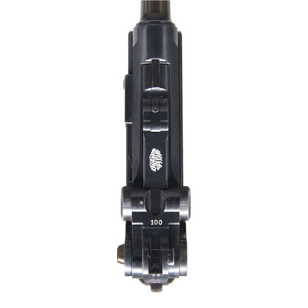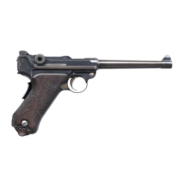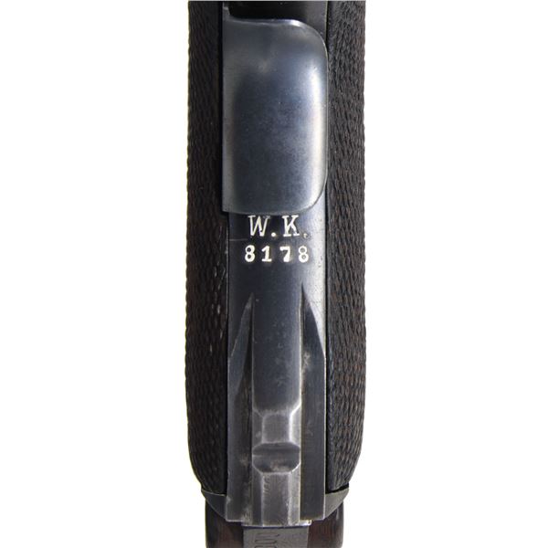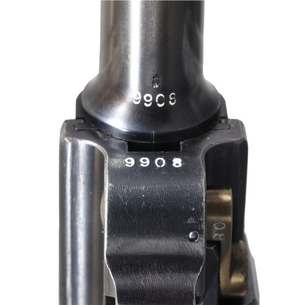NAVY LUGER SEMI-AUTOMATIC PISTOL. Cal. 9mm Luger. S# 9908. Bbl. 5 7/8". Model 1906 1st Issue Navy Luger mfg. by DWM for the Imperial German Navy. The left side of the bbl. extension is marked with a naval crown proof, followed by 2 Naval Crown/M proofs. Toggle is marked with the intertwined "DWM" monogram. Original down safe "GESICHERT" marking has been mostly milled away, with a new "GESICHERT" marking applied in the upper safety position at the time of arsenal alteration. Rear grip strap is Kiel Dockyard marked "W.K./ 8178". Major metal components exhibit what appear to be a period reapplied blue finish overall. Bbl. exhibits a contemporarily reapplied blue finish. Strawed parts have been reheated at one time. Frame is mounted with 2-piece checkered wood grips. Grip safety appears to have been repaired at one time. Most numbers are matching and include the frame, takedown lever, sideplate, trigger, grip safety, bbl., bbl. extension, breechblock, and toggles. MAGS: 1 8-rd. Navy Pattern (S#6309). CONDTIION: metal components retain the majority of their blue finishes, exhibiting areas of wear and thinning that show through to gray and brown patinas, some scattered spots of light to mild pitting (both above and below the finish), as well as some scattered spots of light surface oxidation overall. Strawed parts are very good, as reheated, with the trigger exhibiting areas of wear and thinning that show through to gray patina. Very bright bore, exhibiting consistent light to mild pitting, while retaining strong rifling throughout. Grips show some impressions, as well as scattered nicks and marks from handling and storage, but otherwise remain sturdy and serviceable. (24-6842/MLW). CURIO. $2,500-4,000.