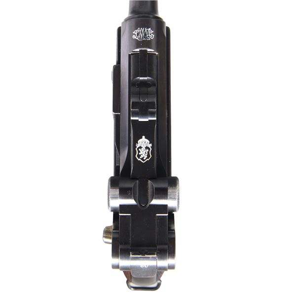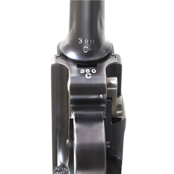 M1911 LUGER SEMI-AUTOMATIC PISTOL WITH HOLSTER. Cal. 9mm Luger. S# 380c. Bbl. 4". 1 of approx. 10,000 M1911 Luger mfg. by DWM under contract for Bulgaria. 2 groups of 5,000 M1911 Lugers were ordered from Bulgaria, with this example, falling within the 2nd Series, exhibiting a "C" suffix to the S#. The top of the chamber is marked with the intertwined "DWM" monogram, with the Bulgarian Coat of Arms marked over the top of the forward toggle link. Right side of the bbl. extension is marked with a Bulgarian Rampant Lion acceptance proof. Safety marking (on frame) and extractor are both properly marked in Cyrillic. Metal components exhibit a professionally reapplied blue finish, with strawed parts having been reheated. Frame is mounted with 2-piece checkered wood grips. Frame features its distinctive lanyard ring at the bottom of the rear grip strap. Matching numbers are present on the frame, takedown lever, sideplate, trigger, safety lever & bar, bbl., bbl. extension, trigger bar, breechblock, as well as on the toggles. Grips are unnumbered. MAGS: 2 8-rds. UNATTACHED ACCESSORIES: Bulgarian black leather holster. CONDITION: extremely fine, as professionally restored, with metal components retaining bountiful amounts of their reapplied finishes overall, exhibiting some scattered spots of light pitting beneath the finishes. Very bright bore (as refinished), exhibiting consistent mild pitting, while retaining strong rifling throughout. Grips are very good, showing mild smoothing overall. Holster remains malleable, exhibiting some wear, while remaining sturdy and serviceable. An extremely attractive example of a professionally restored Bulgarian M1911 Luger pistol. (24-6910/MLW). CURIO. $3,000-4,000.