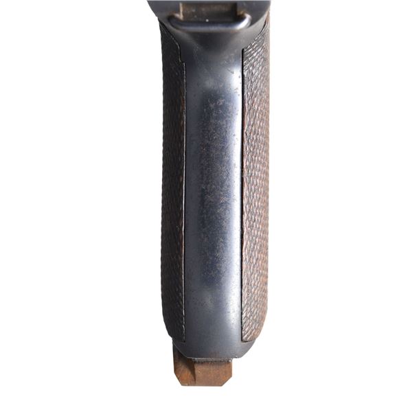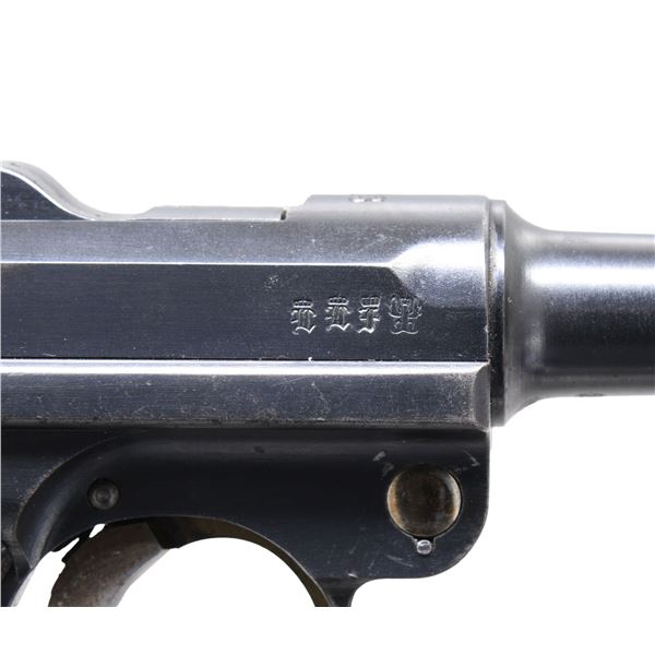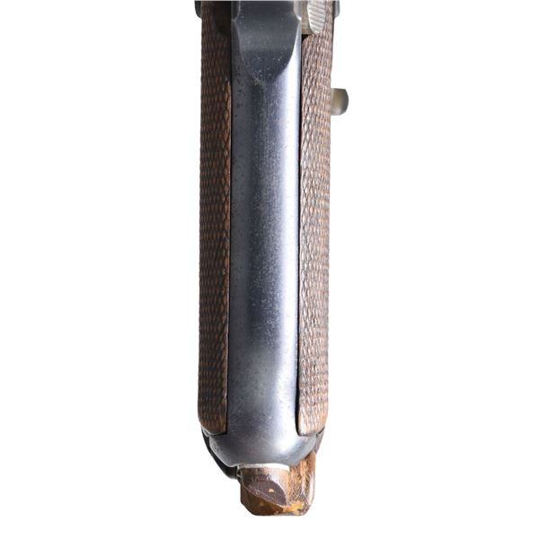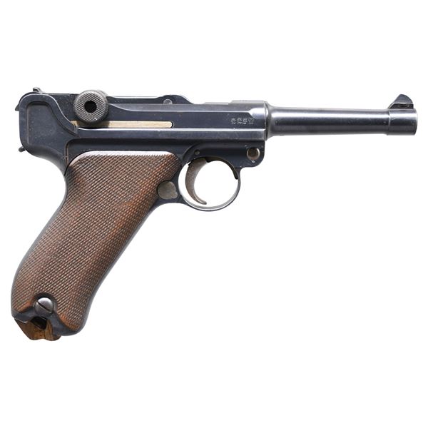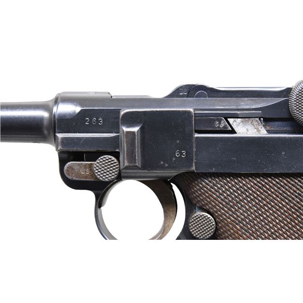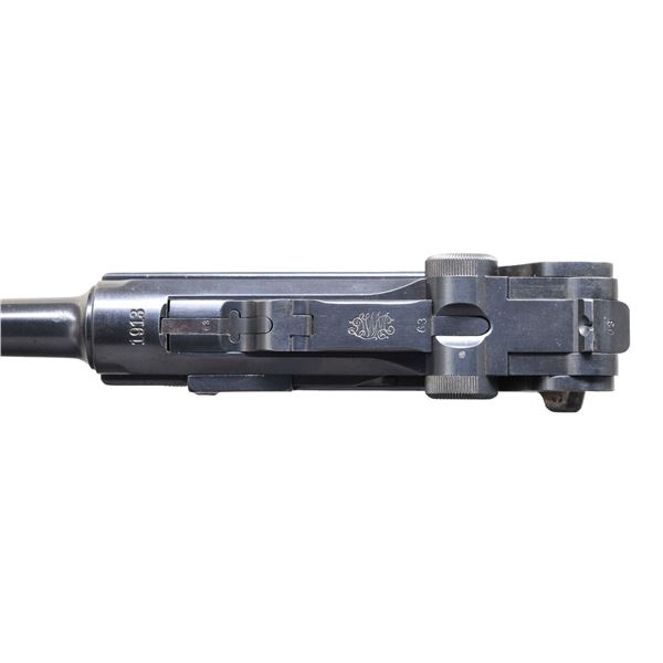 PRE-WORLD WAR I DWM "1913" DATE P.08 LUGER SEMI-AUTOMATIC PISTOL. Cal. 9x19mm. S# 263a. Bbl. 4". P.08 Luger semi-automatic pistol mfg. by DWM under contract for the Imperial German military in 1913. The bbl. extension is marked "1913" over the chamber, with DWM arsenal proofs on the right, and the S# marked on the left. Toggle is marked with the intertwined "DWM" monogram. Major metal components exhibit a rust blue finish, with some small parts exhibiting either a straw or nitre blue finish. Frame is mounted with 2-piece checkered wood grips. Standard sight configuration, with dovetailed blade front sight and V-notch rear sight. This example is unaltered, and was not returned to the arsenal to be retrofitted with a hold-open latch. All serialized parts are matching and include the frame, takedown lever, sideplate, trigger, safety lever & bar, bbl., bbl. extension, trigger bar, breechblock, extractor, firing pin, toggles, as well as the grips. MAGS: 1 wood bottom 8-rd. CONDITION: very good to fine, with metal components retaining bountiful amounts of their original rust blue finish, exhibiting some areas of light to mild wear and thinning, as well as scattered spots of light surface oxidation overall. Front grip strap exhibits mild surface oxidation, with the rear grip strap exhibiting moderate degrees of dark surface oxidation. Strawed parts show varying degrees of wear, with worn areas exhibiting a gray patina and scattered spots of age related discoloration. Mirror bore, exhibiting some very light pitting, while retaining sharp and well defined rifling throughout. Grips show mild smoothing, as well as a few scattered nicks and minor impressions from handling and storage. Wood bottom on mag. has broken, with a large section of the right half no longer being present. An exceptionally attractive, untouched, and unaltered DWM "1913" date P.08 Luger. (25-535/MLW). CURIO. $2,000-4,000.