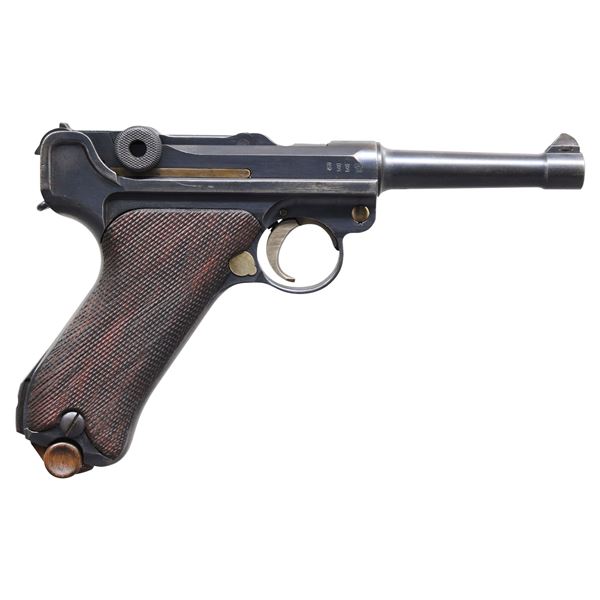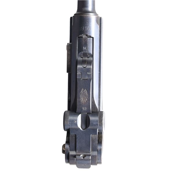 LUGER SEMI-AUTOMATIC PISTOL WITH HOLSTER. Cal. 9mm Luger. S# 5632m. Bbl. 4". Standard configuration P.08 Luger semi-automatic pistol mfg. by DWM in 1916 for the Imperial German military. The bbl. extension is marked "1916" over the chamber, with DWM arsenal proofs marked on the right. Toggle is marked with the intertwined "DWM" monogram. Metal components exhibit what appears to be a period (likely arsenal) reapplied blue finish overall, with the takedown lever, trigger, mag. release button, safety lever, and ejector having been reheated. Frame is mounted with 2-piece checkered wood grips. Standard blade front sight, with V-notch rear sight. Nearly all numbers are matching and include the frame, takedown lever, sideplate, safety lever & bar, hold-open latch, bbl., bbl. extension, breechblock, extractor, toggles, as well as the grips. Trigger and firing pin are unnumbered. MAGS: 1 non-matching 8-rd. UNATTACHED ACCESSORIES: brown leather holster marked "SCHAMBACH&Co/ BERLIN/ 1916". Loading tool is absent. CONDITION: metal components retain large amounts of their period reapplied blue finish, exhibiting areas of wear and thinning that show through to gray and brown patinas, scattered superficial handling marks, as well as some areas of light pitting that are present both above and below the finish. Frame exhibits moderate pitting beneath the grip panels. Grip straps and left frame "ear" exhibit an unusual patina, showing light to mild pitting, as well as striations from prior cleaning. Dark pitted bore, retaining fair rifling throughout. Grips are good, showing mild smoothing, as well as some scattered marks and minor impressions from handling and storage. Left grip panel is poorly fit. Holster remains malleable, exhibiting wear, as well as some areas of light to mild age related cracking overall. (24-6889/MLW). CURIO. $800-1,200.