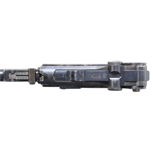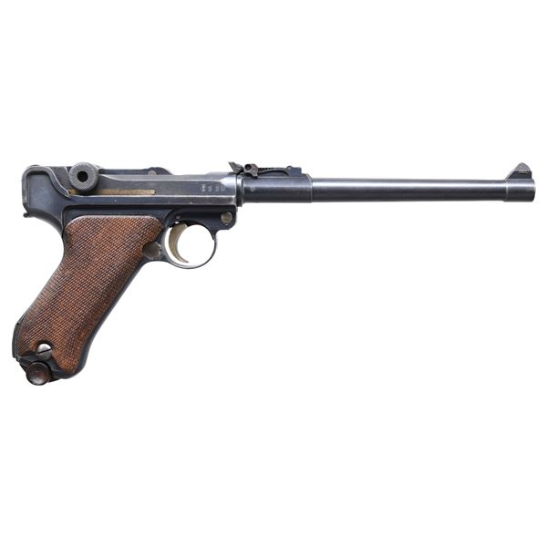 SEMI-AUTOMATIC PISTOL. Cal. 9mm Luger. S# 5163h. Bbl. 7 7/8". LP.08 semi-automatic pistol mfg. by DWM in 1917 for the Imperial German military. The bbl. extension is marked "1917" over the chamber, with DWM arsenal proofs marked on the right. Toggle is marked with the intertwined "DWM" monogram. Metal components exhibit a period blue finish overall, with the frame appearing to have been touched up in a few areas. Strawed parts exhibit a reheated finish. Frame is mounted with 2-piece checkered wood grips. Blade front sight, with adj. V-notch rear sight graduated 1-8. Nearly all serialized parts are matching and include the frame, takedown lever, sideplate, trigger, safety bar, bbl., rear sight assembly, bbl. extension, trigger bar, breechblock, extractor, firing pin, as well as the toggles. Safety lever appears to have been renumbered to match at one time. Left grip panel is unnumbered, with the right panel having been renumbered to match. MAGS: 1 8-rd. mag. with contemporary wood bottom. CONDITION: metal components retain the majority of their period blue finish, exhibiting some areas of wear and thinning that show through to gray and brown patinas, scattered superficial handling marks, as well as some spots of light pitting beneath the finish on the frame and bbl. Front grip strap exhibits some striations from prior cleaning. Strawed parts are excellent, as reheated, with some spots of light pitting overall. Bright bore, exhibiting light to mild pitting, while retaining strong rifling throughout. Grips show some smoothing, as well as some scattered nicks to the diamonds, but otherwise remain sturdy and serviceable. (24-6887/MLW). CURIO. $1,500-2,000.