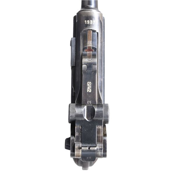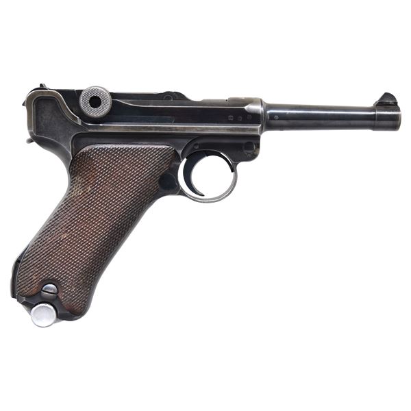 SEMI-AUTOMATIC PISTOL. Cal. 9mm Luger. S# 7485u. Bbl. 4". P.08 Luger semi-automatic pistol mfg. by Mauser for the German military in 1937. Top of the bbl. extension is marked with the 4-digit year of mfg. "1937", with Mauser Eagle/63 proofs marked on the right. Toggle is marked with Mauser's "S/42" mfg. code. Metal components exhibit a salt blue finish overall. Frame is mounted with 2-piece checkered wood grips. Interior of right grip panel is carved with an intertwined "WV". Dovetailed blade front sight, with V-notch rear sight. All serialized parts are matching and include the frame, takedown lever, sideplate, trigger, safety lever & bar, hold-open latch, bbl., bbl. extension, trigger bar, breechblock, extractor, firing pin, toggles, rear toggle pin, as well as the grips. MAGS: 1 8-rd. mag. that appears to have been renumbered to match at one time. CONDITION: metal components retain the majority of their original arsenal salt blue finish, exhibiting areas of wear and thinning that show through to gray and brown patinas, as well as some scattered spots of light pitting overall. Grip straps retain fair amounts of their original bluing, with the balance exhibiting a gray patina. Bore is bright, exhibiting consistent mild pitting, with some spots of darker pitting, while retaining strong rifling throughout. Grips exhibit smoothing overall, with some scattered marks and minor impressions from handling and storage, but otherwise remain sturdy and serviceable. PROVENANCE: the Estate Collection of Charles Wagner. (25-296/MLW). CURIO. $1,200-1,800.