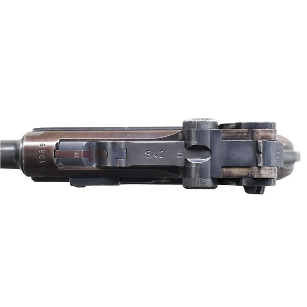 P.08 LUGER SEMI-AUTOMATIC PISTOL. Cal. 9mm Luger. S# 3186p. Bbl. 4". P.08 Luger semi-automatic pistol mfg. by Mauser for the German military in 1939. Top of the bbl. extension is marked with the 4-digit year of mfg. "1939", with Mauser Eagle/63 proofs marked on the right. Toggle is marked with Mauser's "S/42" mfg. code. Metal components exhibit a salt blue finish overall. Frame is mounted with 2-piece checkered wood grips. Dovetailed blade front sight, with fixed V-notch rear sight. All serialized parts are matching and include the frame, takedown lever, sideplate, trigger, safety lever & bar, hold-open latch, bbl., bbl. extension, trigger bar, breechblock, extractor, firing pin, toggles, rear toggle pin, as well as the grips. MAGS: 1 blued matching 8-rd. with Eagle/63 proofed aluminum bottom. CONDITION: metal components retain the majority of their original arsenal salt blue finish, exhibiting some areas of light to mild wear and thinning (primarily on the bbl., bbl extension, and edges), some superficial handling marks, as well some scattered spots of light to mild surface oxidation and pitting. Bright bore, exhibiting mild pitting, while retaining well defined rifling throughout. Grips show mild smoothing, as well as some superficial marks and minor impressions from handling and storage, but otherwise remain sturdy and serviceable. PROVENANCE: the Estate Collection of Charles Wagner. (25-297/MLW). CURIO. $1,200-1,800.