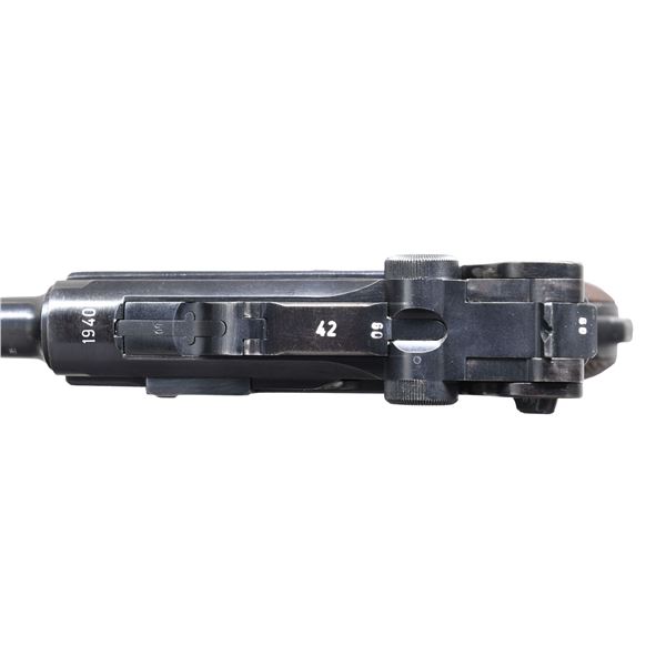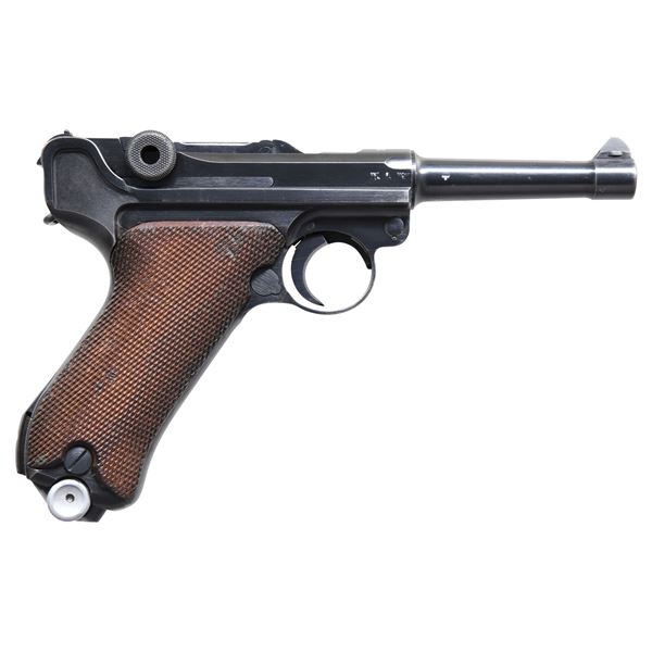 P.08 LUGER SEMI-AUTOMATIC PISTOL WITH HOLSTER. Cal. 9mm Luger. S# 2809m. Bbl. 4". P.08 Luger semi-automatic pistol mfg. by Mauser in 1940. The top of the bbl. extension is marked "1940" over the chamber, with Mauser Eagle/655 proofs and an eagle firing proof marked on the right. Toggle is marked with Mauser's "42" mfg. code. Metal components exhibit a salt blue finish overall. Frame is mounted with 2-piece checkered wood grips. Dovetailed blade front sight, with fixed V-notch rear sight. All serialized parts are matching and include the frame, takedown lever, sideplate, trigger, safety lever & bar, hold-open latch, bbl., bbl. extension, trigger bar, breechblock, extractor, firing pin, toggles, rear toggle pin, as well as the mag. Grip screws are contemporary replacements. MAGS: 1 matching 8-rd., and 1 post-war 8-rd. marked "2/1001". UNATTACHED ACCESSORIES: black leather holster marked "P.08", followed by an encircled "GRAF/ 1940/ LEIPZIG", and an Eagle/WaA170" on the rear, containing an unmarked loading tool. CONDITION: excellent, with metal components retaining bountiful amounts of their blue finish, exhibiting some concentrated spots of wear and thinning, as well as some scattered spots of light surface oxidation overall. Very bright bore, exhibiting light pitting in the grooves and on the edges of the lands, while retaining well defined rifling throughout. Grips show some light smoothing, as well as scattered superficial marks and minor impressions from handling and storage. Holster remains malleable, exhibiting some light wear, as well as some light age related cracking and crazing. (24-6911/MLW). CURIO. $1,200-1,800.