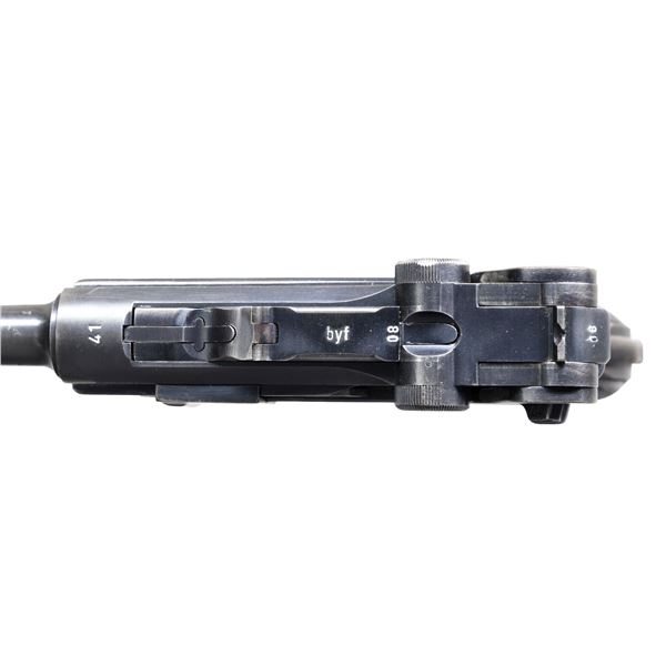 LUGER SEMI-AUTOMATIC PISTOL WITH HOLSTER. Cal. 9mm Luger. S# 5908. Bbl. 4". Standard configuration "Black Widow" P.08 Luger semi-automatic pistol mfg. by Mauser in 1941. The bbl. extension is marked with the 2-digit year of mfg "41" over the chamber, with Mauser Eagle/655 and Eagle/135 arsenal proofs marked on the right. Toggle is marked with Mauser's clandestine "byf" mfg. code. Left side of the frame is marked "P.08". Metal components exhibit a salt blue finish overall. Frame is mounted with 2-piece checkered black plastic grips. Standard blade front sight, with V-notch rear sight. All serialized parts are matching and include the frame, takedown lever, sideplate, trigger, safety lever & bar, hold-open latch, bbl., bbl. extension, trigger bar, breechblock, firing pin, toggles, as well as the rear toggle pin. MAGS: 2 black plastic bottom "fxo" mags. UNATTACHED ACCESSORIES: black leather holster marked "P.08" above "JEAN WEIPERT/ OFFENBACH/ 1941" and an Eagle/WaA668" proof, containing a loading tool. CONDITION: good, with metal components retaining the majority of their original arsenal salt blue finish, exhibiting areas of wear and thinning that show through to gray and brown patinas, some scattered superficial handling marks, a few scratches, as well as some spots of light to mild surface oxidation and pitting. Bore exhibits scattered spots and areas of mild to moderate dark pitting, while retaining well defined rifling throughout. Grips are good, showing mild smoothing and some areas of flattening to the diamonds. Holster remains malleable, exhibiting some wear and scattered marks from handling and storage, with age related cracking present primarily on the closure flap and mag. pouch. (24-6903/MLW). CURIO. $1,500-2,250.