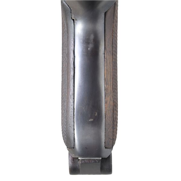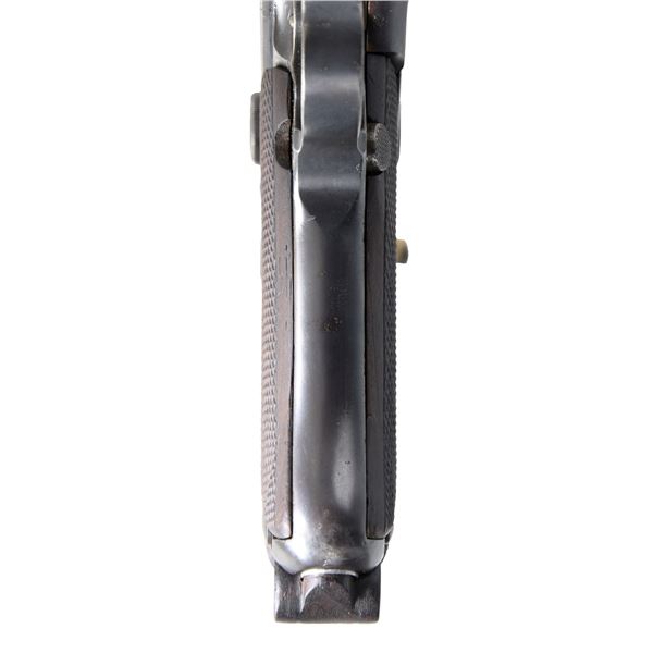 PISTOL. Cal. 9x19mm Parabellum. S# 725. Bbl. 3 1/8". Custom "Baby Luger" semi-automatic pistol produced by an unknown maker. Toggle is marked with the intertwined "DWM" monogram. Front of the frame is marked "GERMANY" below the S#, which is also present on the right side of the bbl. extension. Underside of the bbl. is stamped with a spurious German Crown/N commercial nitro proof. Metal components exhibit a reapplied blue finish overall, with some small parts including the takedown lever, trigger, safety lever, and ejector exhibiting a reheated straw finish. Frame is fitted with 2-piece custom wood grips. Frame has been professionally shortened, with a few porous spots visible on the exterior and a distinctive line present on the interior. Bbl. extension has been fitted with a contemporary production 3" bbl., with the muzzle/front side band appearing to have been threaded on. Aftermarket dovetailed blade front sight, with standard fixed V-notch rear sight. All serialized parts are matching and include the frame, sideplate, trigger, safety lever & bar, bbl., bbl. extension, breechblock, extractor, firing pin, and toggles, with most parts having been renumbered to match. MAGS: 1 spuriously matching shortened 6-rd. CONDITION: very good, with metal components retaining the majority of their reapplied blue finish, exhibiting some spots of light to mild wear, a few spots of light surface oxidation, as well as some spots of mostly mild pitting beneath the bluing. Frame exhibits heavy pitting beneath the bluing under the grip panels. Strawed parts exhibit some light wear and thinning, with varying degrees of surface oxidation present overall. Brilliant mirror bore, exhibiting well defined rifling throughout. Grips show some light smoothing and a few light superficial handling marks, with the left grip exhibiting a repaired break at the bottom left corner of the panel. A well made custom DWM "Baby Luger". (25-1423/MLW). MODERN. $1,500-2,500.