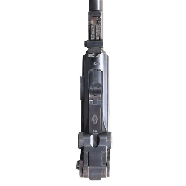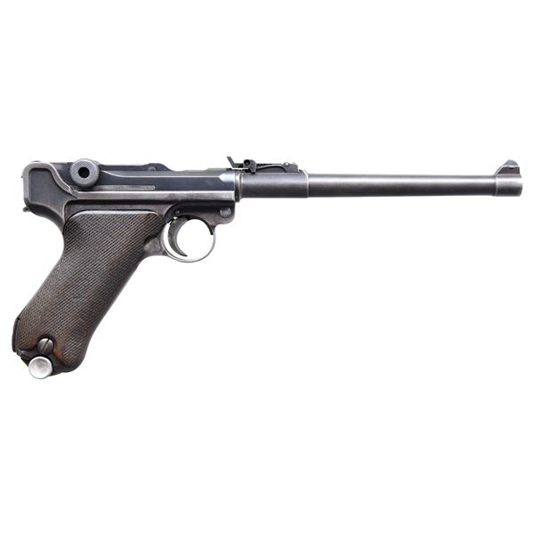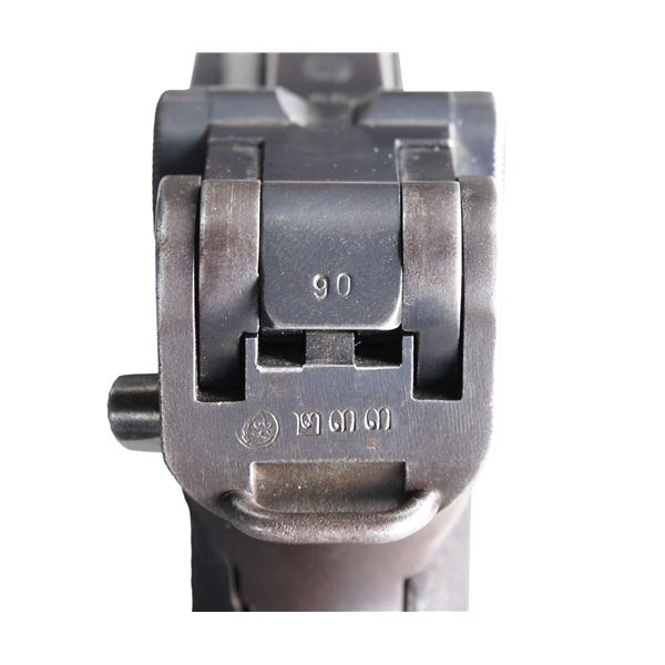 SEMI-AUTOMATIC PISTOL. Cal. 9mm Luger. S# 3490v. Bbl. 7 7/8". 1 of only 100 LP.08 Luger semi-automatic pistol mfg. by Mauser under contract for the Bangkok police in Thailand. The bbl. extension is marked with the 4-digit year of mfg. "1936" over the chamber, with a double crowned "U" commercial proof marked on the left (also present on left side of breechblock and on front face of the front sight block). Toggle is marked with the Mauser banner logo. Rear of frame is marked with with a Siamese lion head within a circle proof, followed by a Bangkok police property number in Siamese numerals (#233). Underside of frame exhibits an Odin import mark, just ahead of the trigger guard. Metal components exhibit a blue finish overall, with some small parts retaining some traces of their original straw finish. Frame is mounted with 2-piece checkered wood grips. Dovetailed blade front sight, with adj. V-notch rear sight. Nearly all numbers are matching and include the frame, takedown lever, sideplate, trigger, safety lever & bar, bbl. extension, trigger bar, breechblock, extractor, firing pin, as well as the toggles. Grips are unnumbered and hold-open latch is numbered "91" (more than likely coming from the next pistol in the contract). Bbl. is unnumbered and rear sight is mis-matched, as is corrected for this contract. MAGS: 1 blued non-matched (S# 3464v, within the correct Thai LP.08 contract S# range) mag. with aluminum bottom, appropriately marked with a "+" above an Eagle/63 proof. CONDITION: metal components retain good amounts of their original factory blue finish, exhibiting wear and thinning that shows through to a dark gray patina, as well as light oxidation and light pitting overall, to be expected from firearms issued and used in a tropical environment. Sides of bbl. extension (at rear) and sides of frame (beneath the grip panels) exhibit moderate pitting. Strawed parts retain traces of their original finish, with the balance exhibiting a gray patina and scattered spots/areas of age related discoloration. Very bright bore, exhibiting light to mild pitting, while retaining well defined rifling throughout. Grips show heavy smoothing, as well as some superficial marks and minor impressions from handling and storage, but otherwise remain sturdy and serviceable. Mag. exhibits areas of wear and thinning that show through to gray patina, with areas of oxidation and pitting present overall. Mag. bottom exhibits a brown patina, that is consistent with Bangkok's climate. A very scarce example of a Thai contract Mauser LP.08 Luger pistol. PROVENANCE: the Estate Collection of Charles Wagner. (25-291/MLW). CURIO. $2,000-3,000.