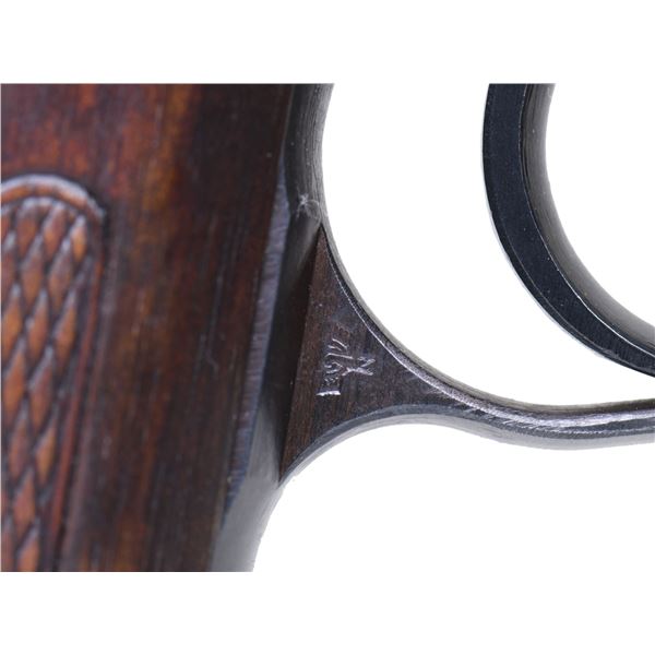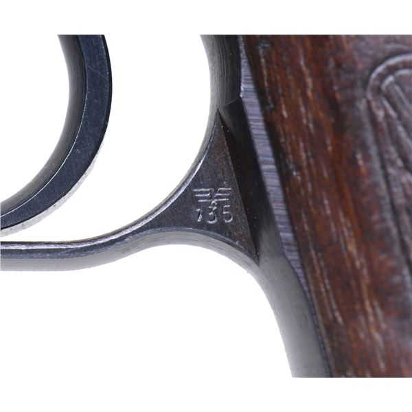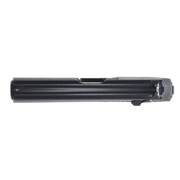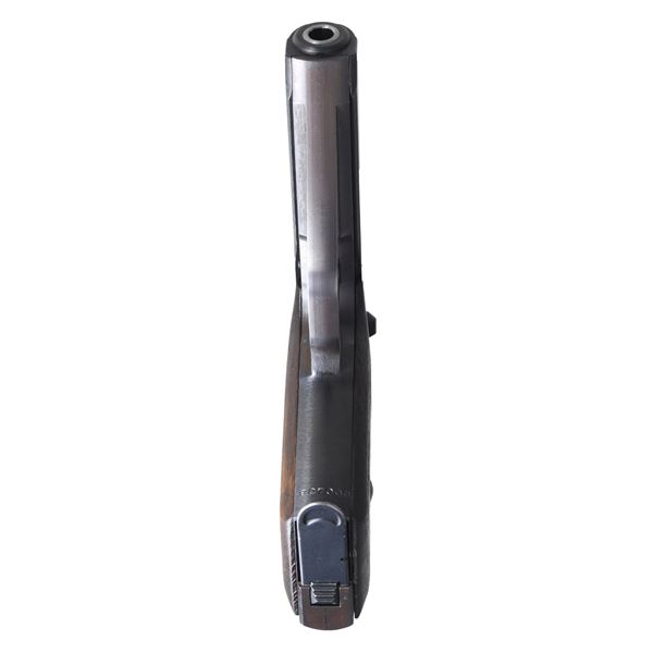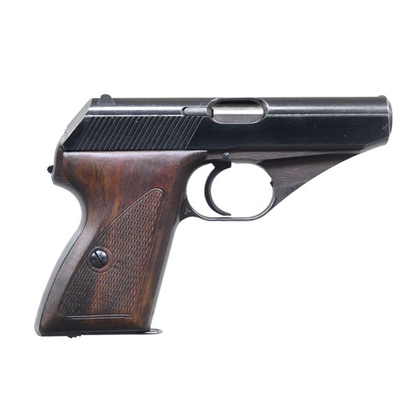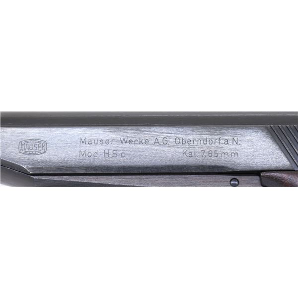 PISTOL WITH HOLSTER. Cal. 7.65mm. S# 827098. Bbl. 3 1/4". HSc semi-automatic pistol mfg. by Mauser for the German military during World War II. Left side of the slide is marked with the Mauser banner logo, followed by "Mauser-Werke A.G. Oberndorf a.N./ MOD. HSc "Kal. 7,65mm". Left side of frame is marked with an Eagle/135 military acceptance proof on the rear trigger guard web, with an Eagle/N commercial nitro proof marked on the right. Metal components exhibit a blue finish overall, save for on the bbl., which is polished in-the-white. Frame is mounted with 2-piece checkered wood grips. Grooved top strap of the slide features an integral blade front sight, with a dovetailed U-notch rear sight. All serialized parts are matching and include the frame, slide, and bbl. MAGS: 2 8-rd. 1 with parkerized body, 1 with in-the-white body. UNATTACHED ACCESSORIES: black leather holster marked "jhg/ 44" on the closure strap flap. CONDITION: exceptional, with metal components retaining bountiful amounts of their original blue finish overall, exhibiting some very light edge wear on the forward edges of the slide and trigger guard, with some light superficial marks around the takedown latch on the interior of the trigger guard from prior disassembly. Exposed chamber area shows some age related discoloration, but is otherwise fine. Brilliant mirror bore, exhibiting sharp and well defined rifling throughout. Grips are excellent, showing a few minor marks from handling and storage, and a few minor chips around the screw slot. Holster remains malleable, exhibiting areas of light to mild age related cracking and crazing, but otherwise remains sturdy and serviceable. A truly exceptional example of a military accepted Mauser HSc, that the discerning collector would find nearly impossible to upgrade from. (24-6829/MLW). CURIO. $1,000-1,500.