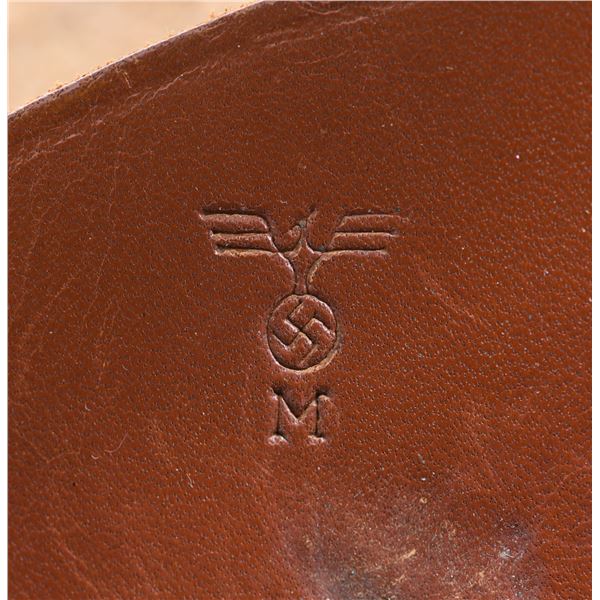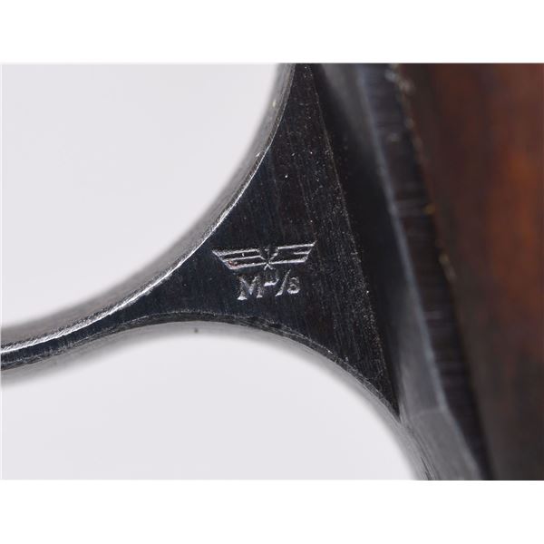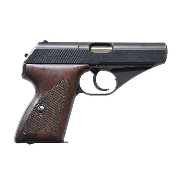 MAUSER MODEL HSC SEMI-AUTOMATIC PISTOL WITH HOLSTER. Cal. 7.65mm. S# 839420. 3 1/4". 1 of only approx. 4,500 "4th Variation" HSc semi-automatic pistols mfg. by Mauser for the German Kriegsmarine, according to "Axis Pistols" by Jan. C. Still. The left side of the slide is marked with the Mauser banner logo, followed by markings stipulating Mauser's mfg. information, as well as the model and cal. designations. Left side of the rear trigger guard web is marked with a Kriegsmarine Eagle/ MIII/ 3 proof, with a German Eagle/N (also present on the right side of the slide) commercial nitro proof marked on the right. Metal components exhibit a salt blue finish overall, save for on the bbl., which is polished in-the-white. Frame is mounted with 2-piece flat checkered wood grips. Top of slide features a grooved sight channel, fixed blade front sight, and dovetailed U-notch rear sight. All serialized parts are matching and include the frame, slide, and bbl. Safety lever appears to be caught on the firing pin, only moving approx. half way down to the safe position, but still allowing disassembly. MAGS: 2 7-rd. UNATTACHED ACCESSORIES: brown leather holster marked with an Eagle/M on the body, beneath the closure flap. CONDITION: excellent, with metal components retaining bountiful amounts of their original arsenal salt blue finish, exhibiting some mild edge wear, a few scattered superficial handling marks, as well as mild thinning on the rear grip strap that shows through to gray patina. Mirror bore, exhibiting a few small spots of what appears to be very light surface level pitting, while retaining well defined rifling throughout. Grips are very good, showing some superficial marks and minor impressions from handling and storage. Holster remains malleable, exhibiting some wear, as well as areas of age related cracking and crazing. A very attractive example of a Kriegsmarine 4th Variation Mauser Model HSc pistol. (24-6847/MLW). CURIO. $1,200-1,800.